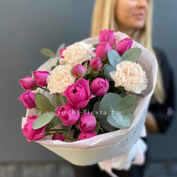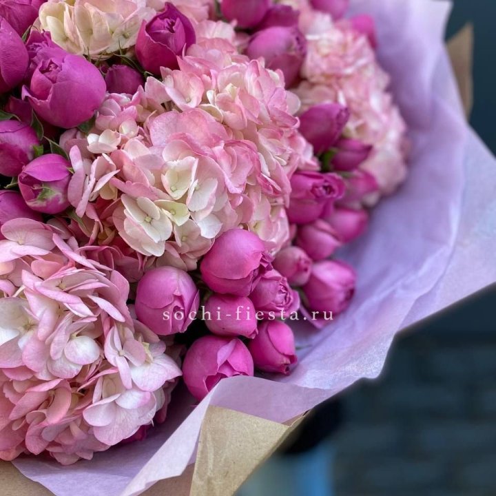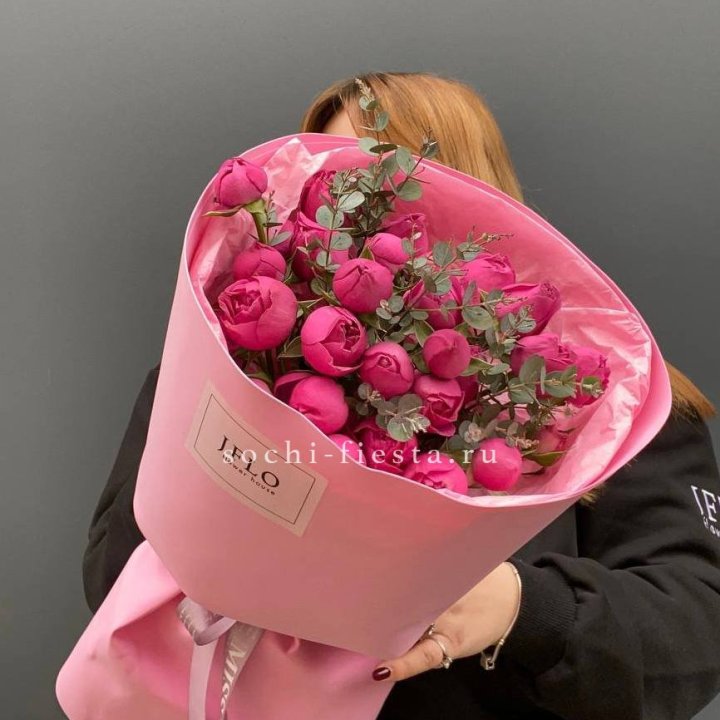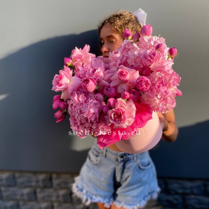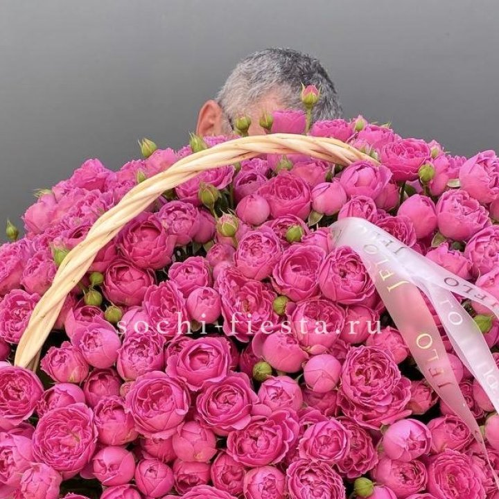 Цветочная корзина из пионов и пионовидных роз "Юниверсити"