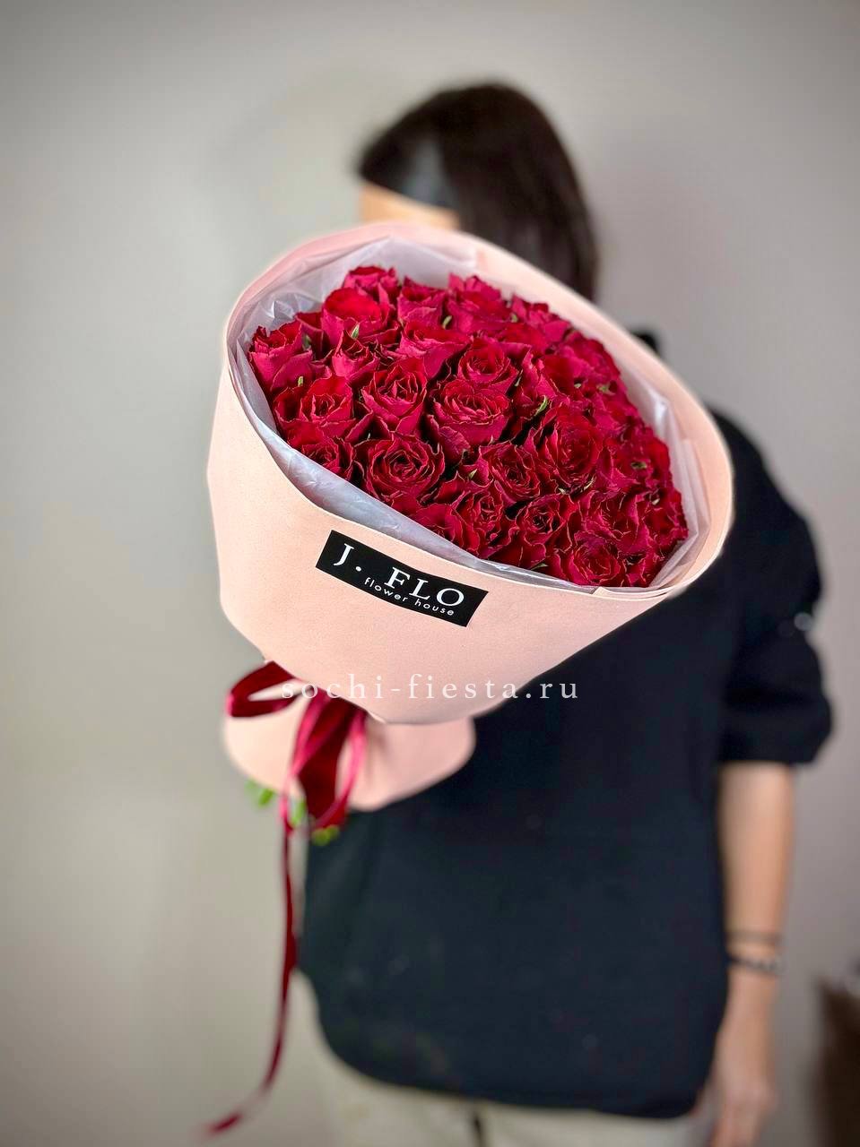 Сто одна кенийская роза в едином цилиндре — это впечатляющий масштаб и безупречная симметрия. Плотный силуэт и насыщенный цвет создают мощное визуальное присутствие. Композиция звучит сама за себя.