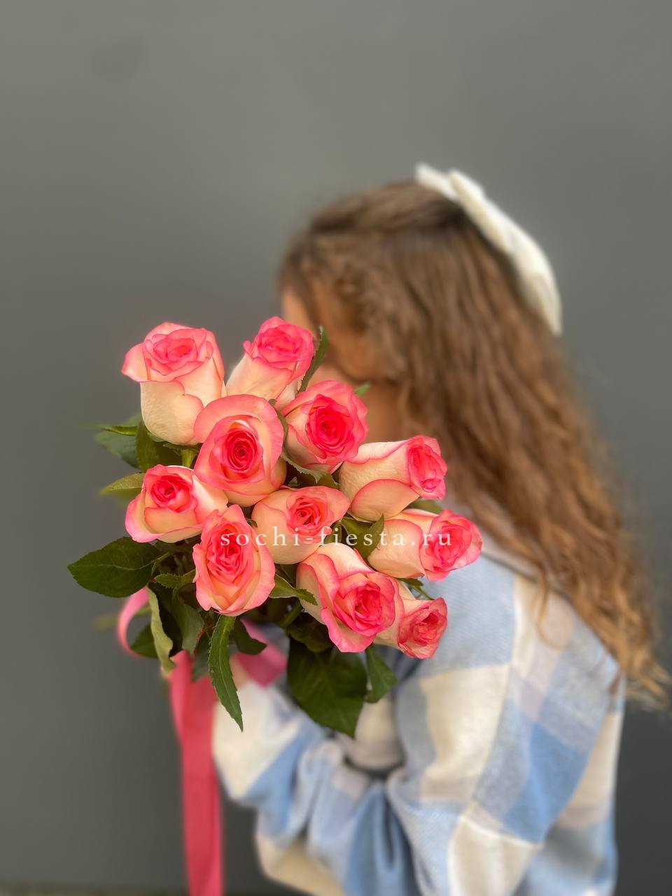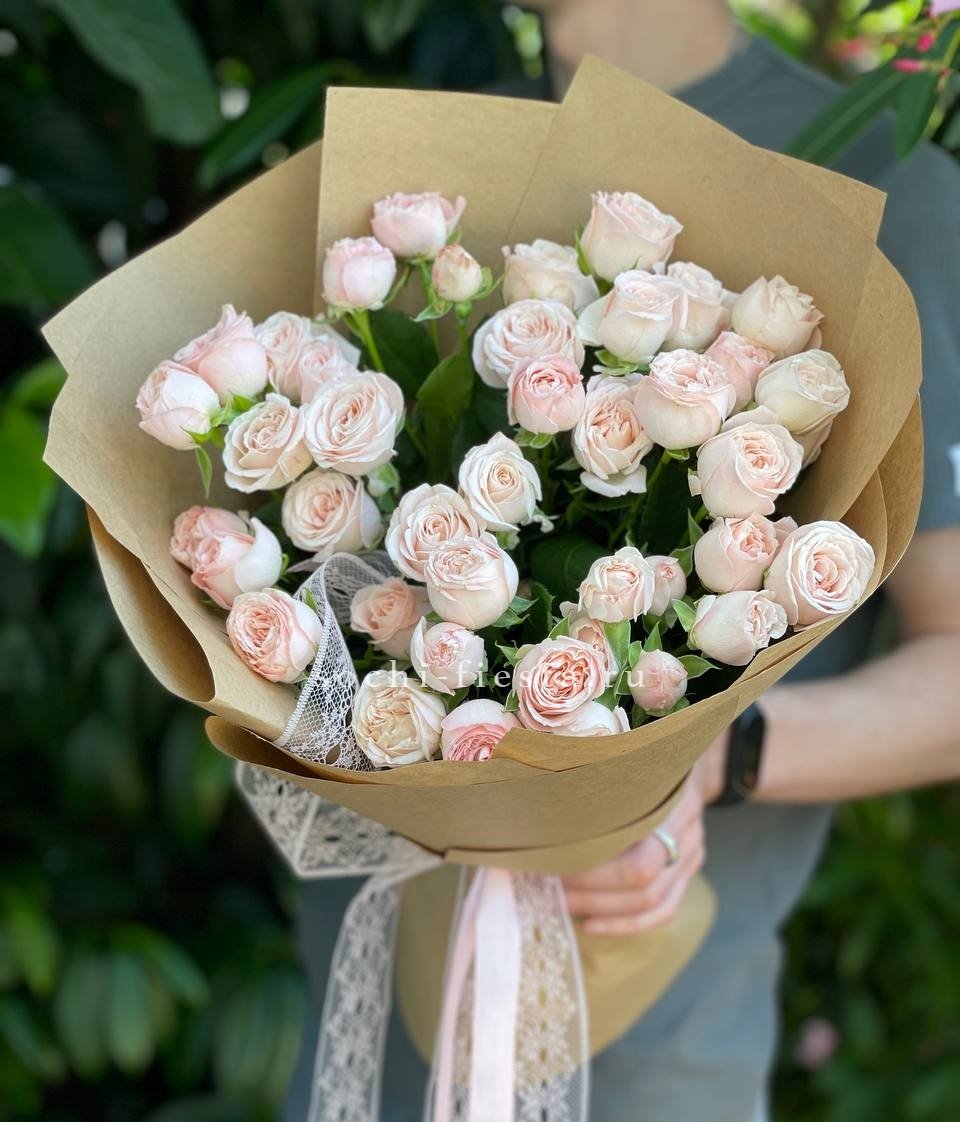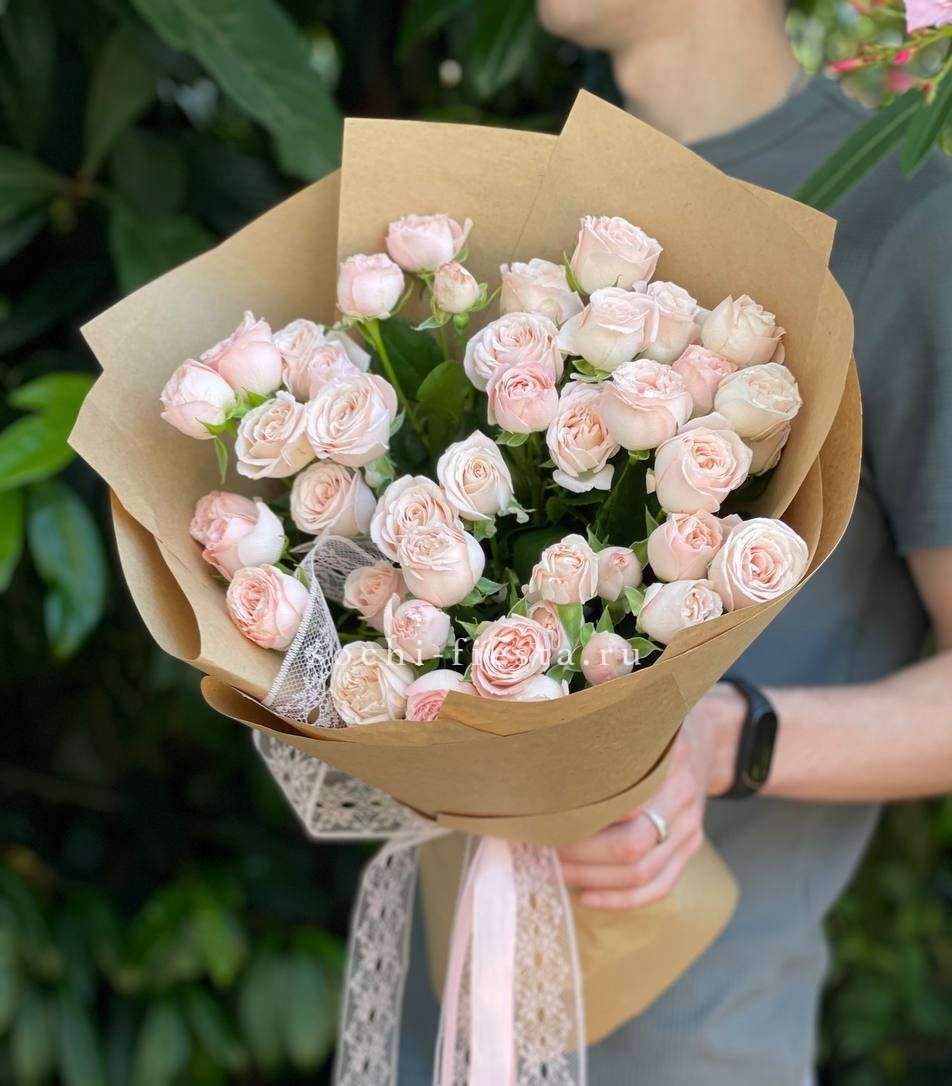 Одиннадцать кустовых роз с густыми многолепестковыми бутонами в нежно-розовой гамме. Каждая ветка раскрывается несколькими головками, создавая пышную объемную форму. Для тех, кто любит выразительные букеты с характером.