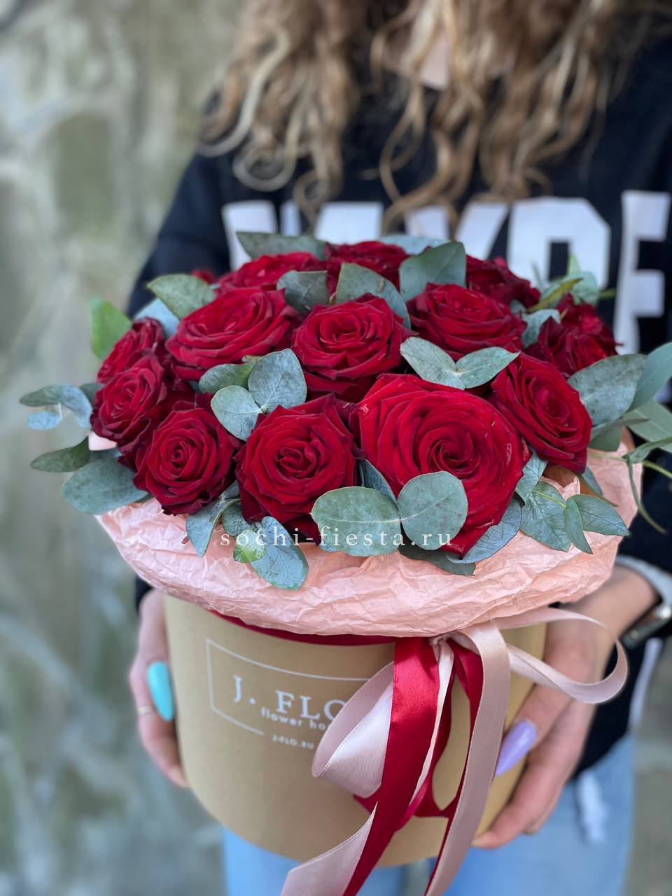 Пятнадцать вывернутых роз Джумилия раскрывают свою многослойную структуру в каждом бутоне. Эвкалипт обрамляет композицию, подчёркивая фактуру лепестков.