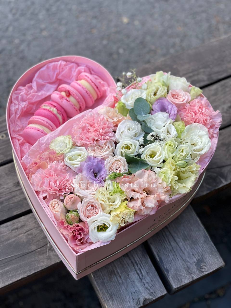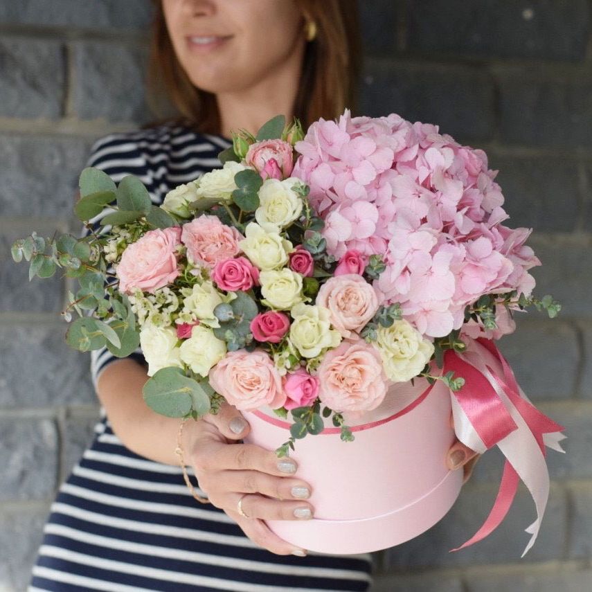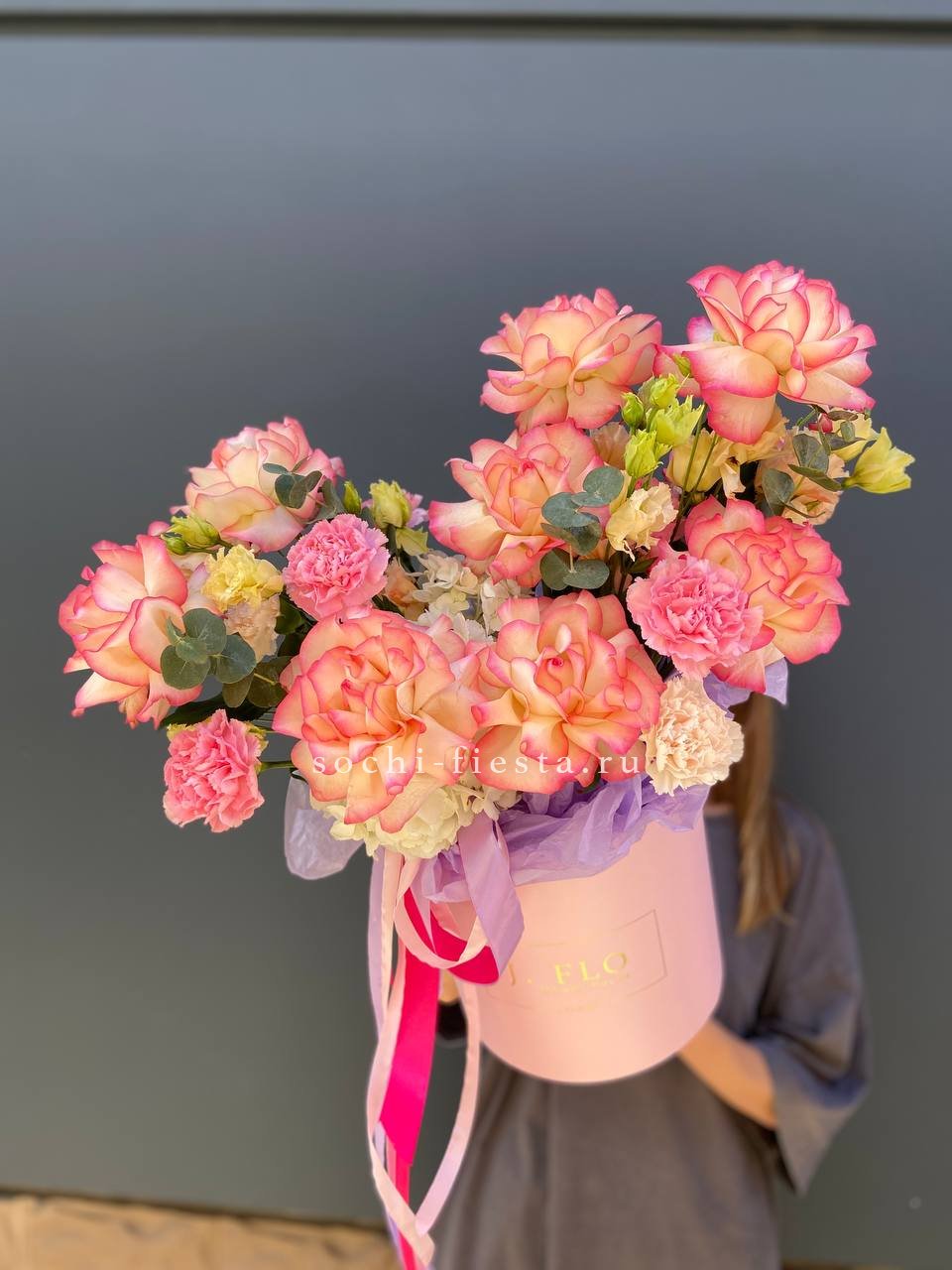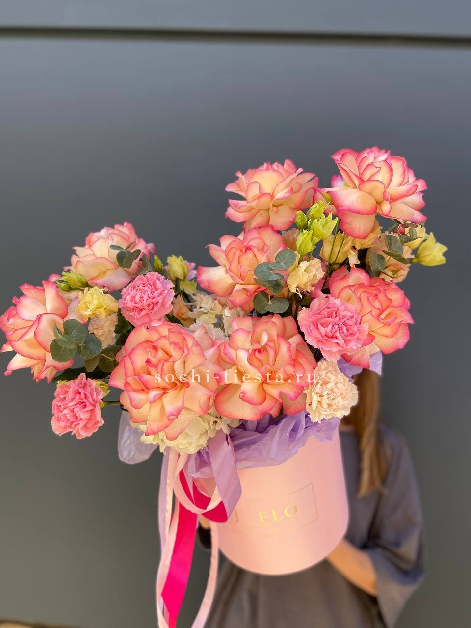 Пышная композиция в круглом боксе объединяет розы, эустому, хризантемы и диантус в плотную цветущую массу. Бомбастик добавляет объёма, а эвкалипт смягчает переходы между соцветиями. Готовое решение для размещения на столе или комоде.