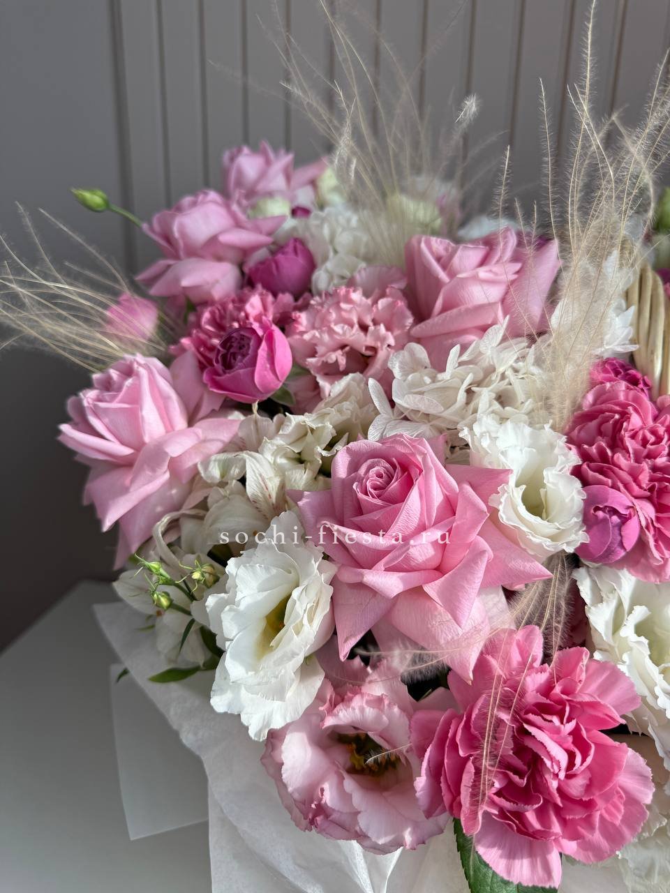 диантус, розовые розы, бомбастик, хризантемы, эустома, эвкалипт, бокс №20