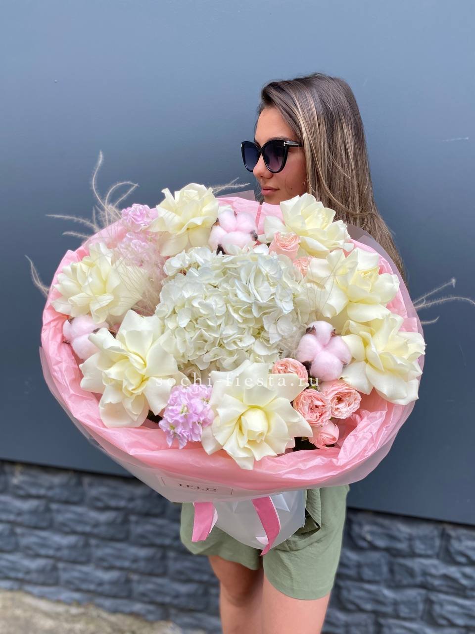 гортензия, хлопок, бомбастик, белая роза, маттиола- может меняться от сезона на диантус, ковыль, упаковка.