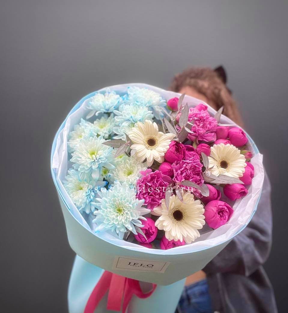 хризантемы кустовая, геребры, диантусы, пионовидные розы Мисти Бабблс, эвкалипт,  лента, упаковка.