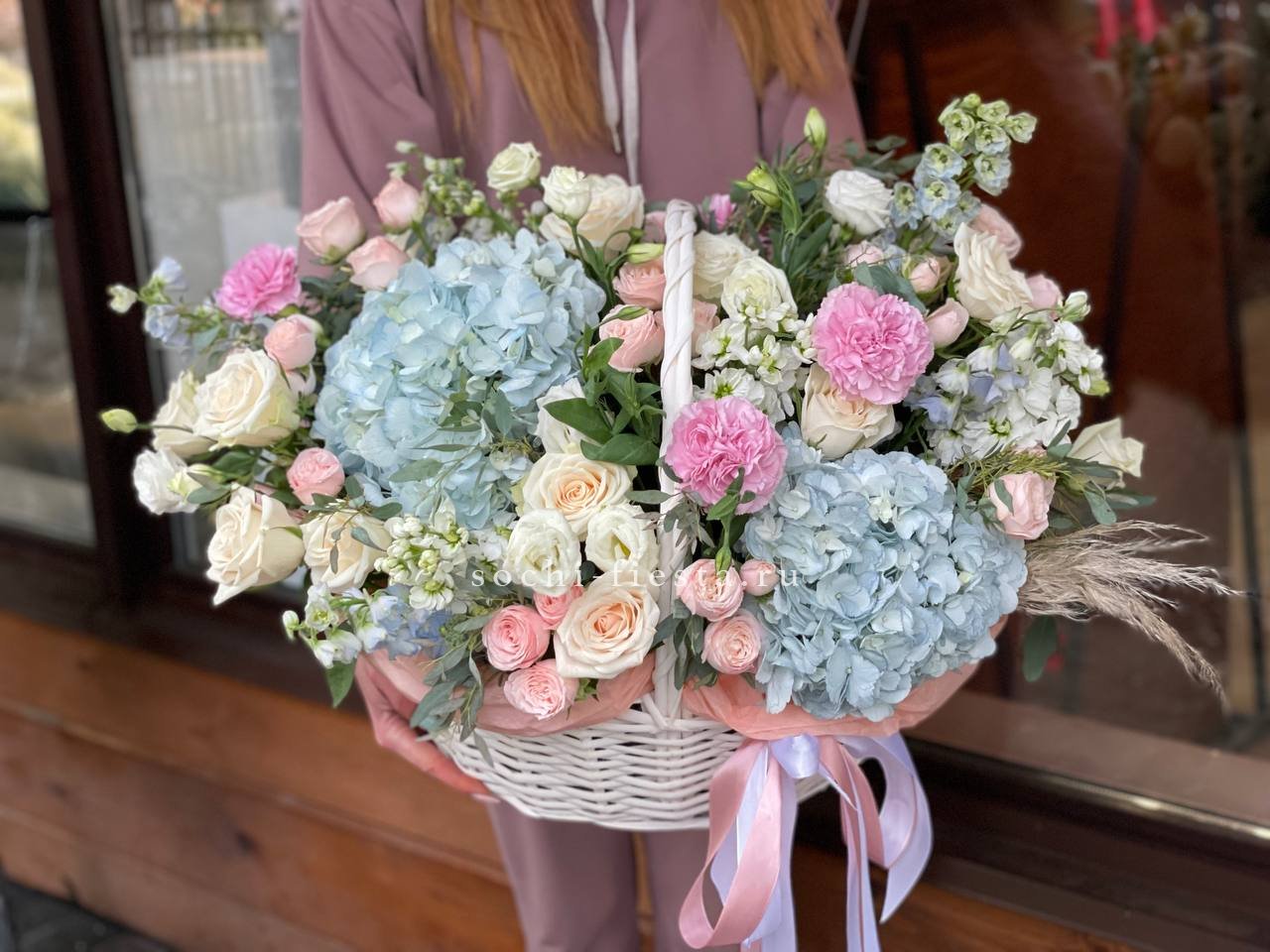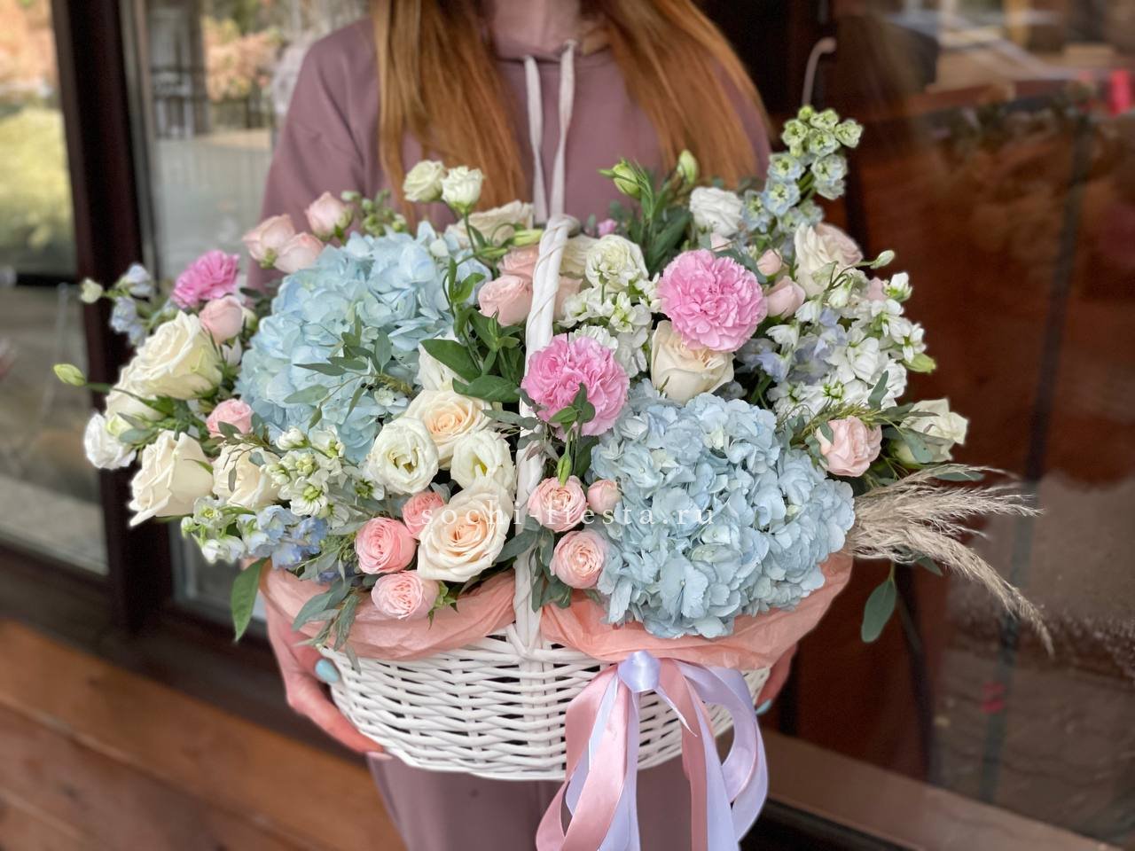 гортензия, бомбастик, роза, эустома, эвкалипт, авторское оформление.