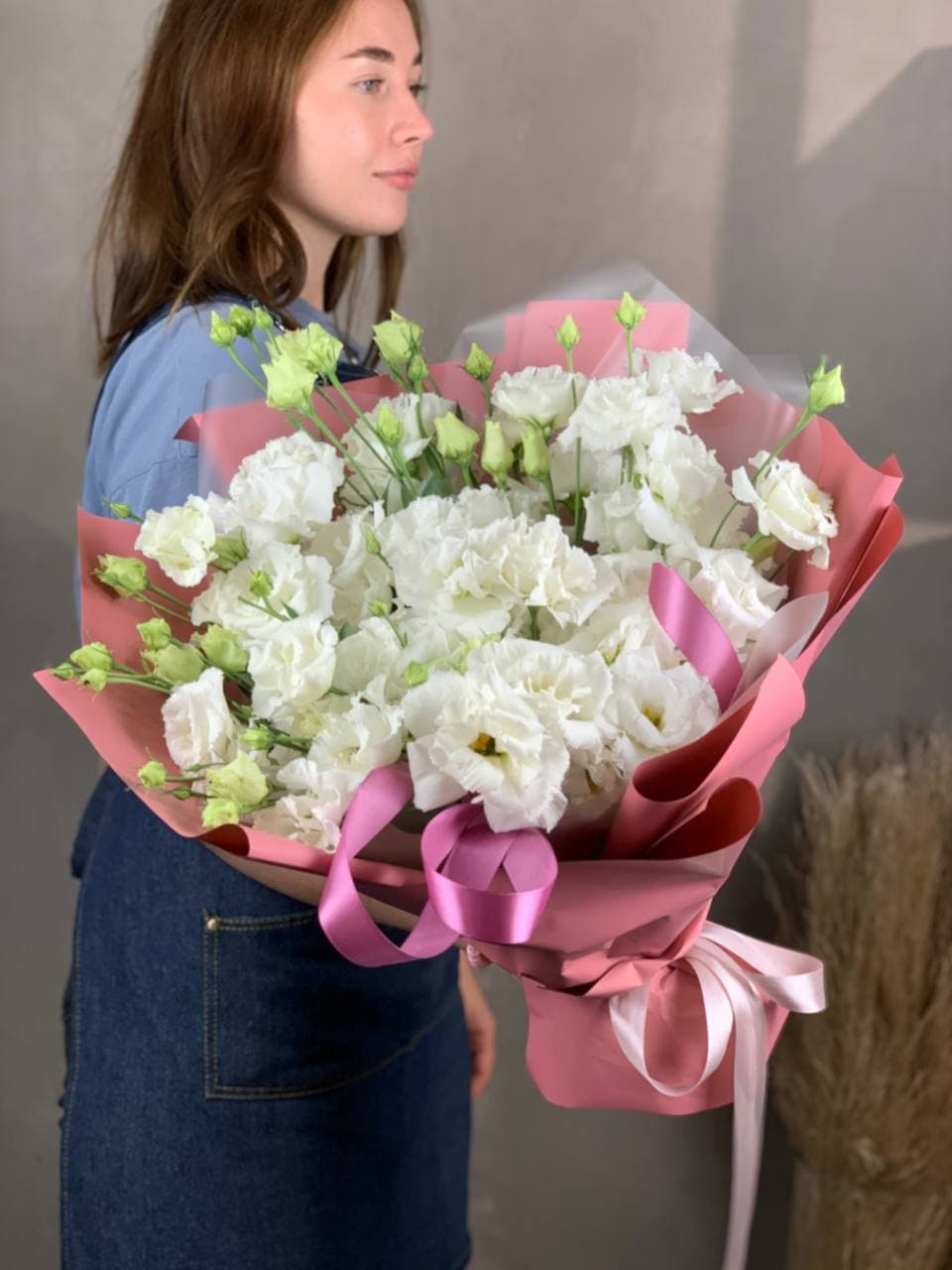 Монохромная композиция из белоснежных эустом в количестве пятидесяти одной штуки. Масштабная сборка впечатляет чистотой линий и графичным присутствием в пространстве.