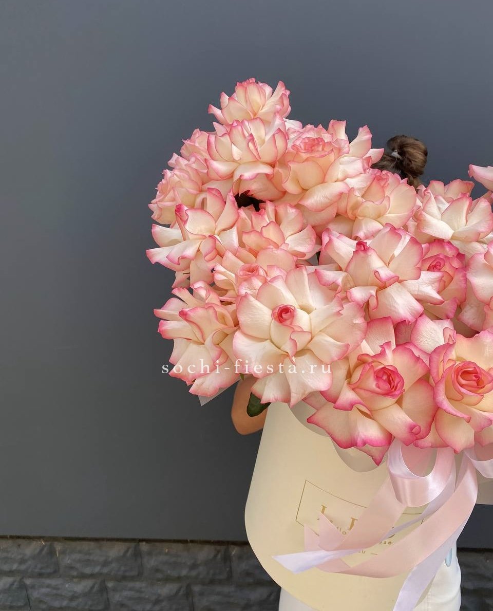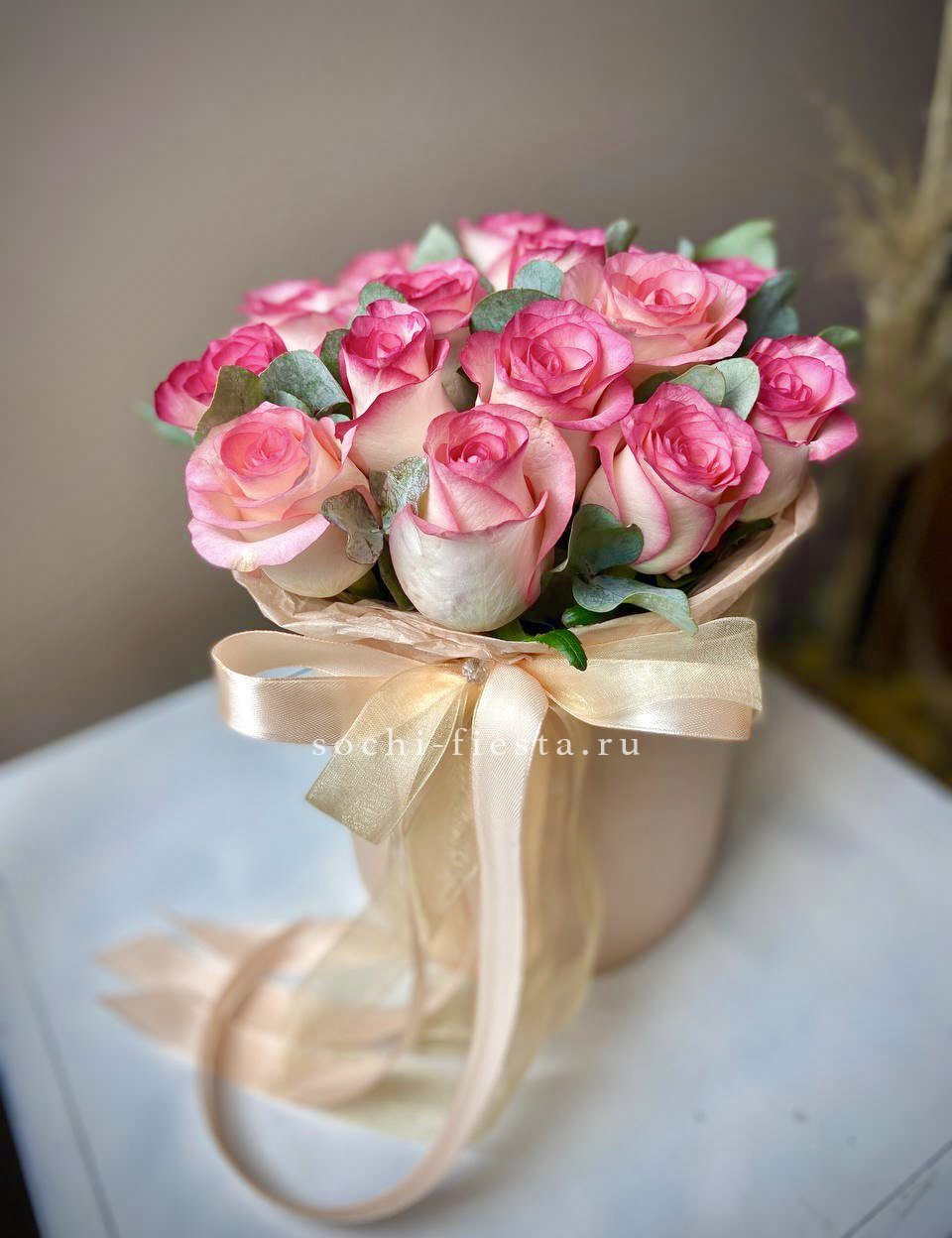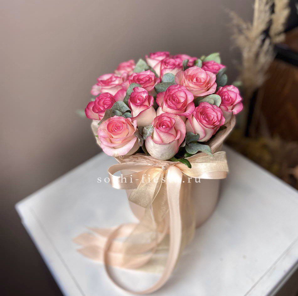 гортензия, эустома, диантусы, французские розы, эвкалипт, цилиндр D20.