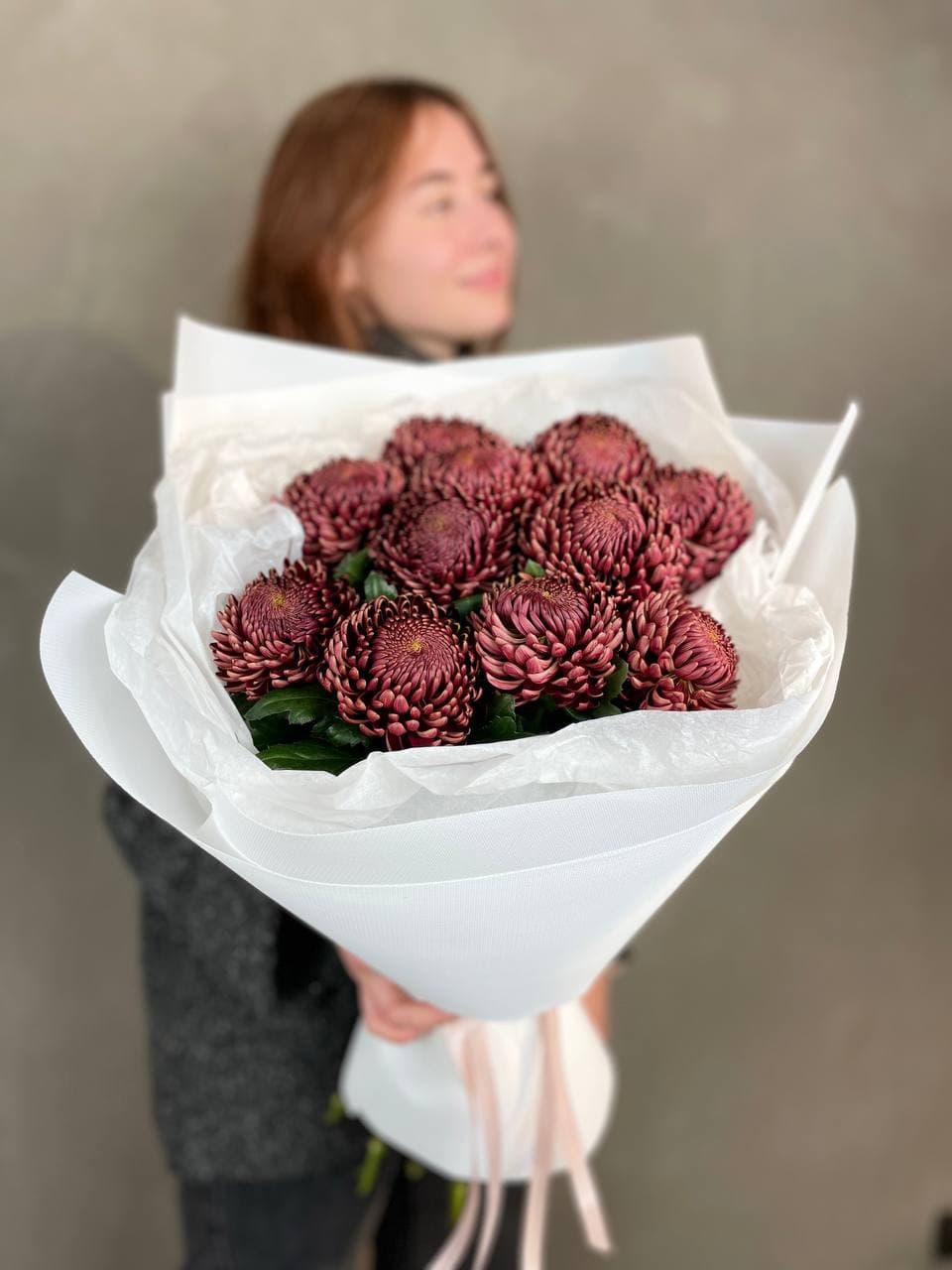 Одиннадцать крупных хризантем Cassiopeia собраны в плотный букет с выразительным объёмом. Каждый бутон раскрыт полностью, создавая насыщенную текстуру и живую игру света на лепестках.