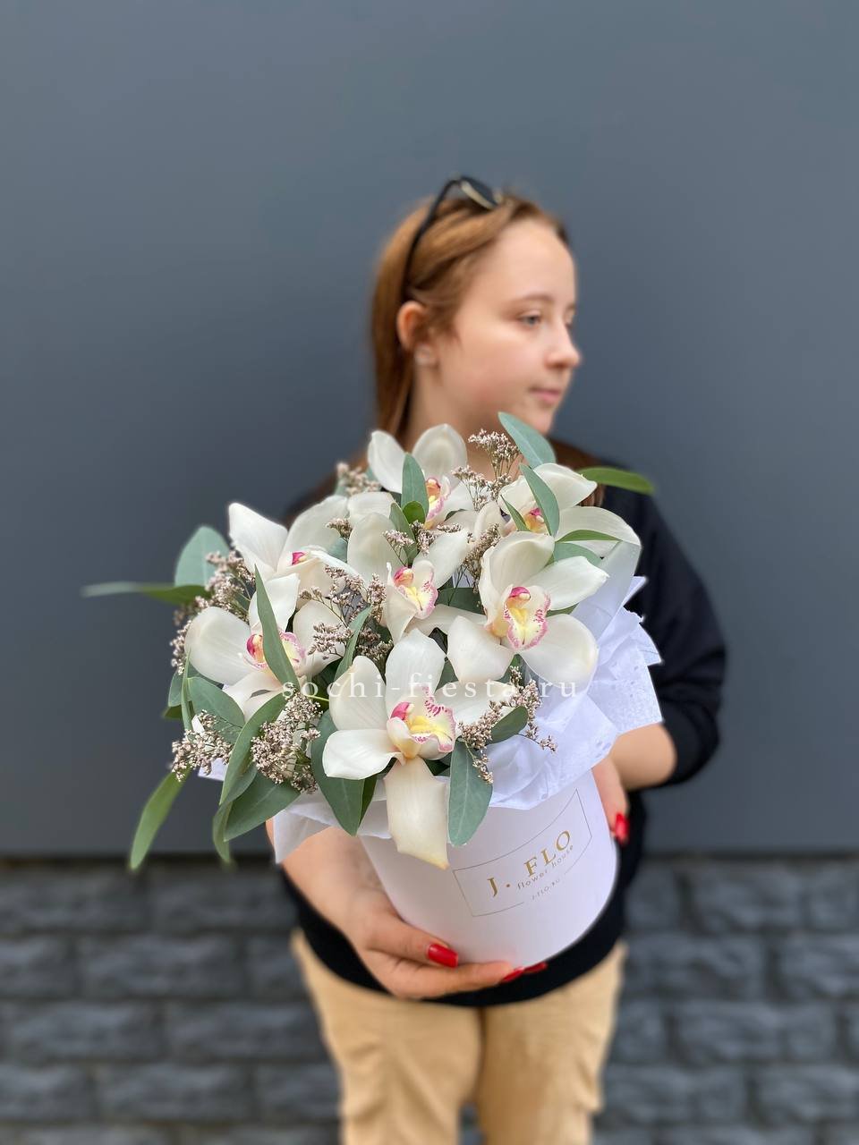 Цимбидиум в круглом боксе дополнен лимониумом и эвкалиптом. Композиция компактна, держит форму и долго сохраняет свежий вид.