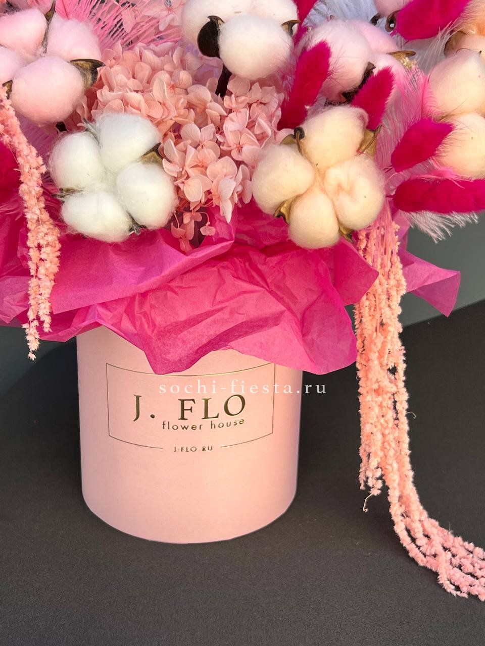 Композиция в цилиндре с лагурусом, хлопком и амарантом создает впечатление природной гармонии. Перья вносят легкость. Удобна в размещении и долго сохраняет первоначальный вид.