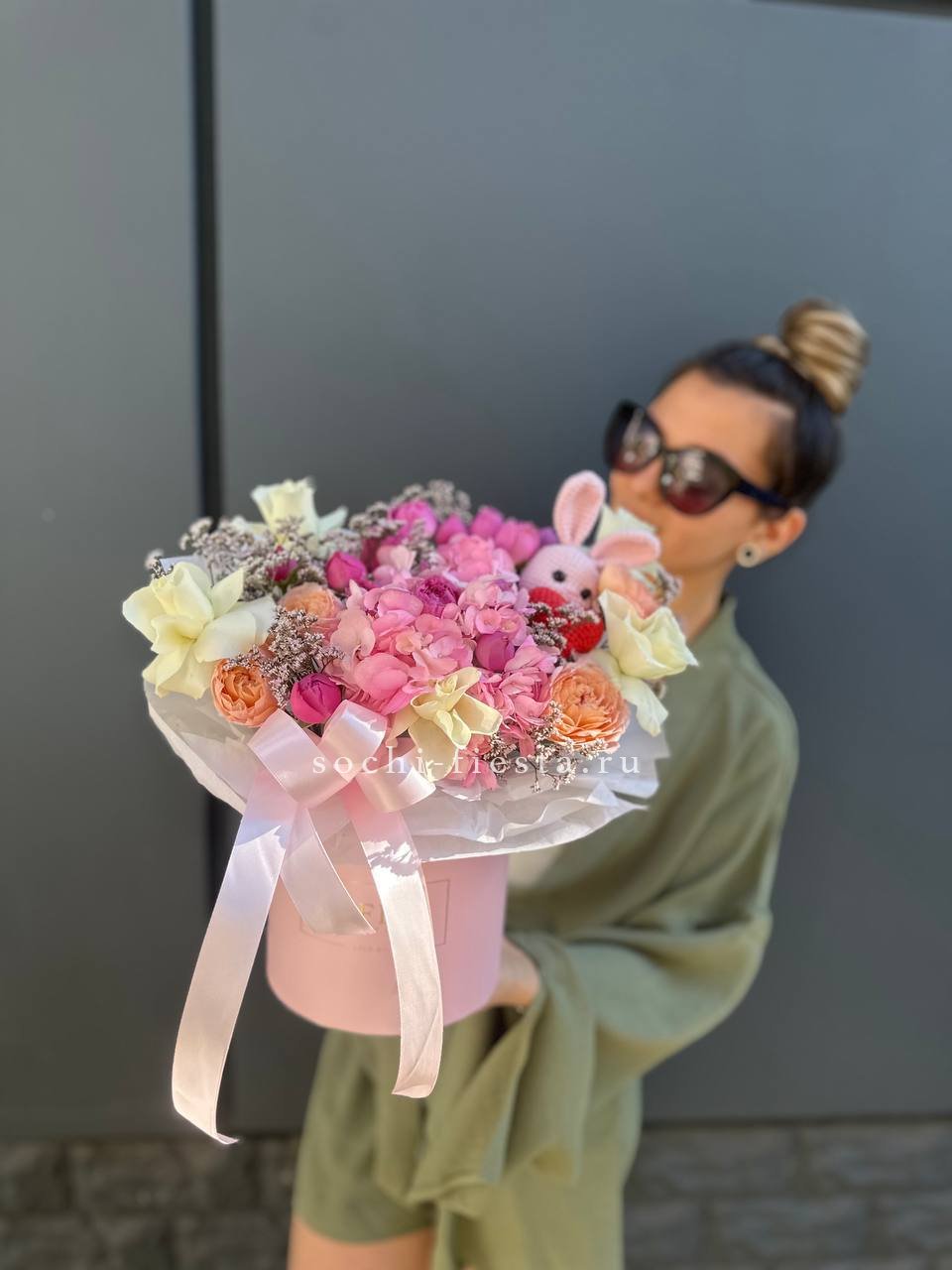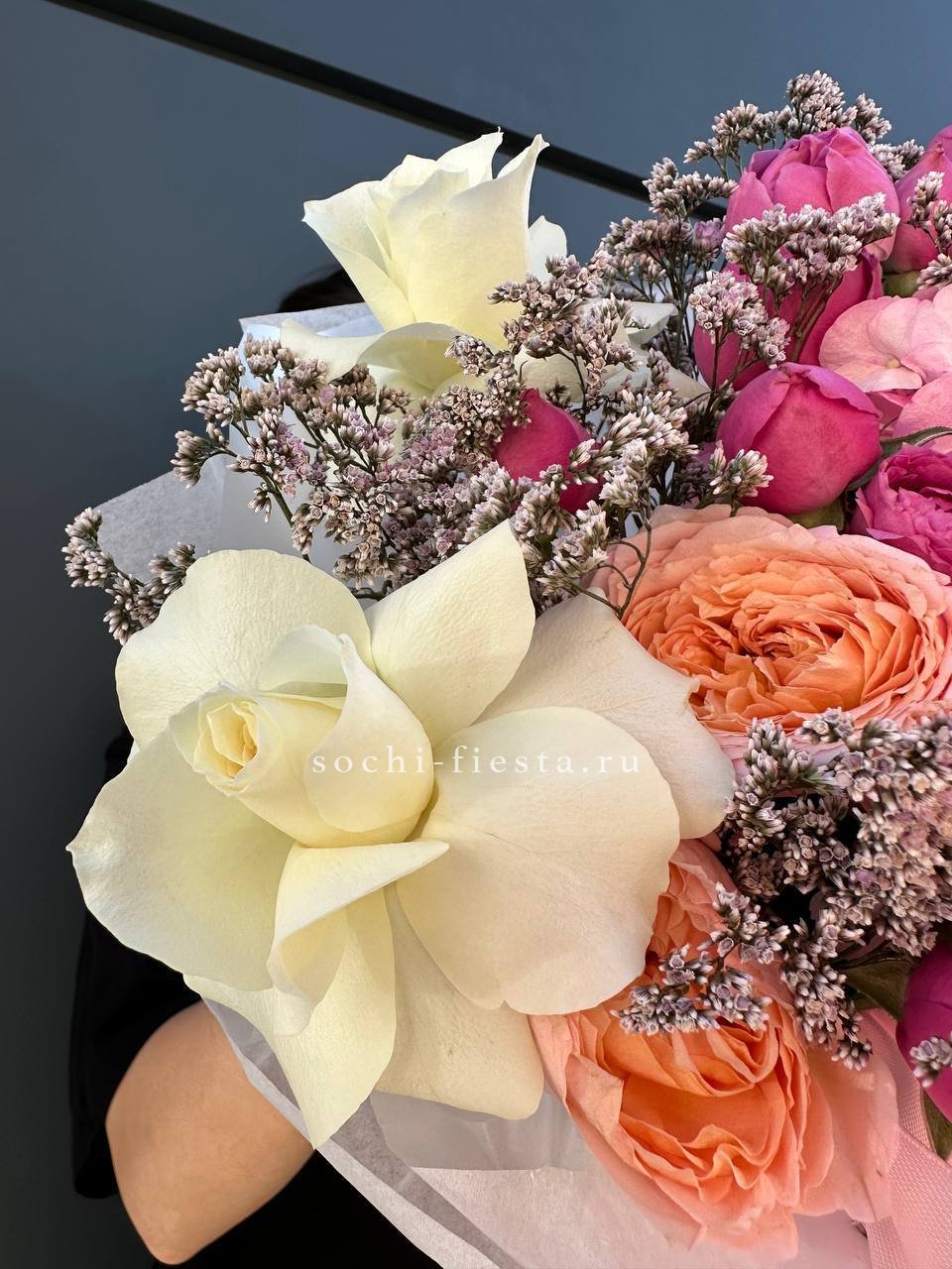 Сочетание вывернутых роз с гортензией, диантусами, розами, бомбастиками создает воздушных элегантный образ идеального цветочного подарка