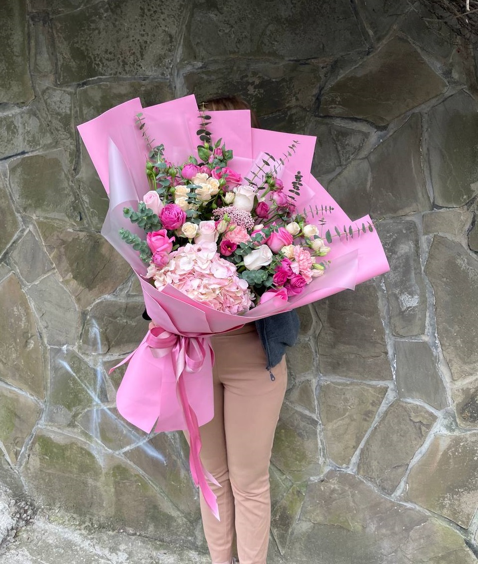 Paulina — это сложная работа с объёмом и воздухом. Гортензия создаёт мягкую основу, а кустовые розы Мисти Баблс и эустома добавляют графичности. Диантус и эвкалипт разбивают плотность, позволяя букету дышать и занимать пространство по-новому.