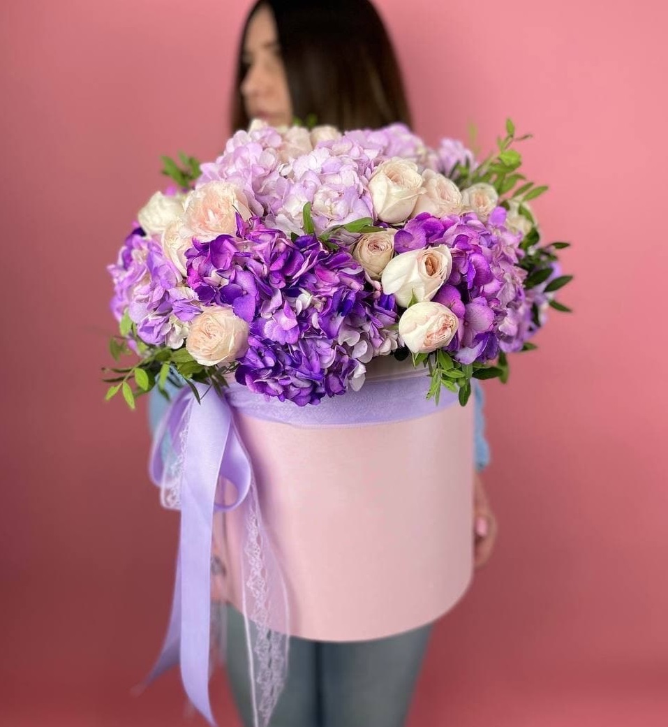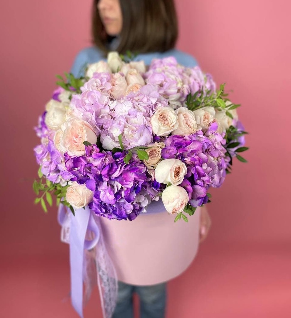 Гортензия и кустовые розы соединяются с веточками эвкалипта и ваксфлауэра в свободной композиции. Разная плотность соцветий создаёт живой ритм и природную лёгкость.