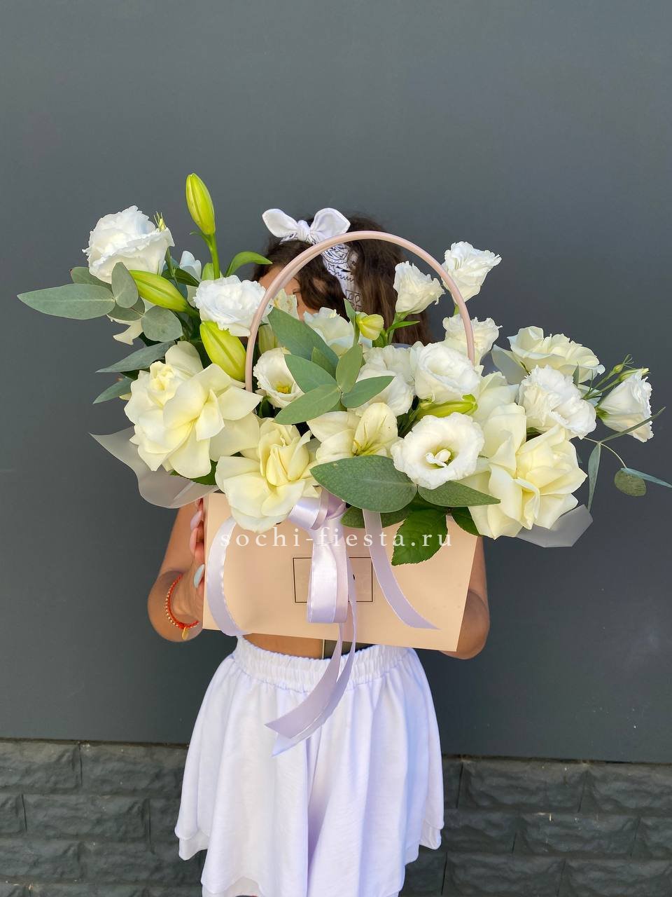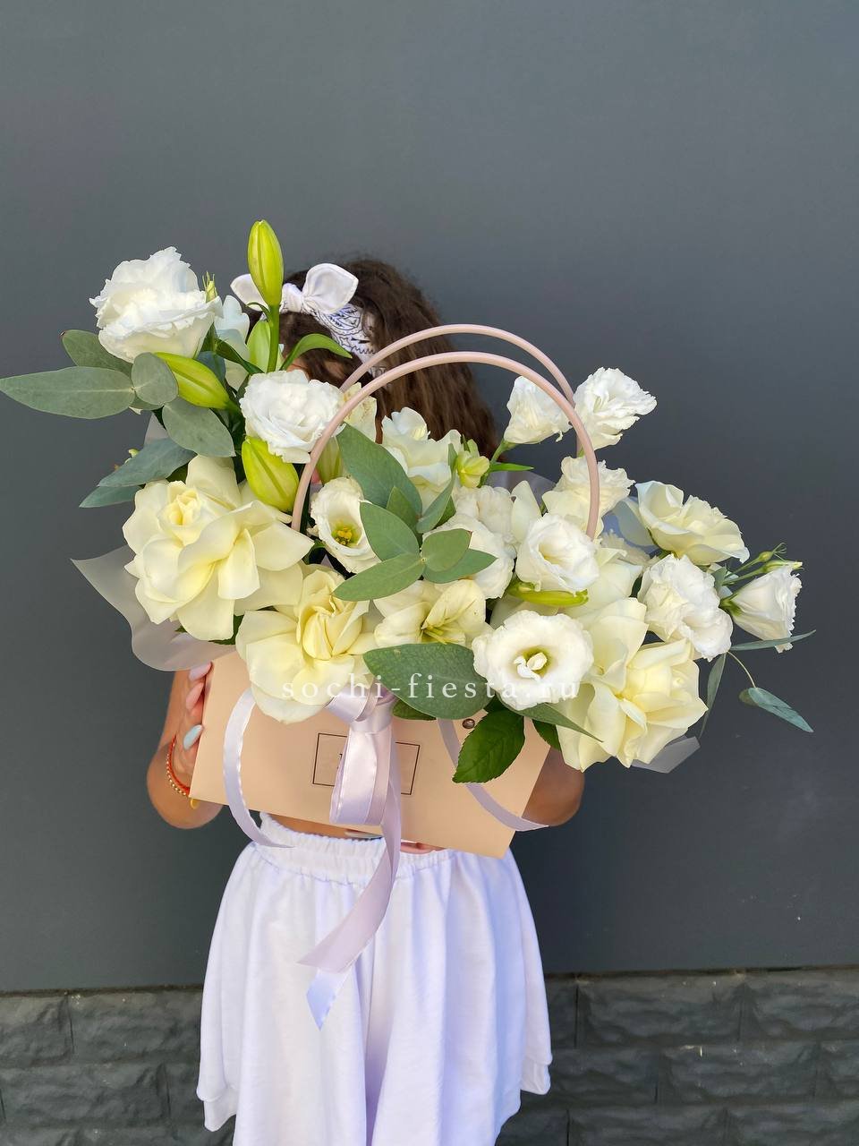 Белые французские розы раскрываются крупными бутонами и соседствуют с воздушной эустомой. Композиция создает ощущение легкости и света.