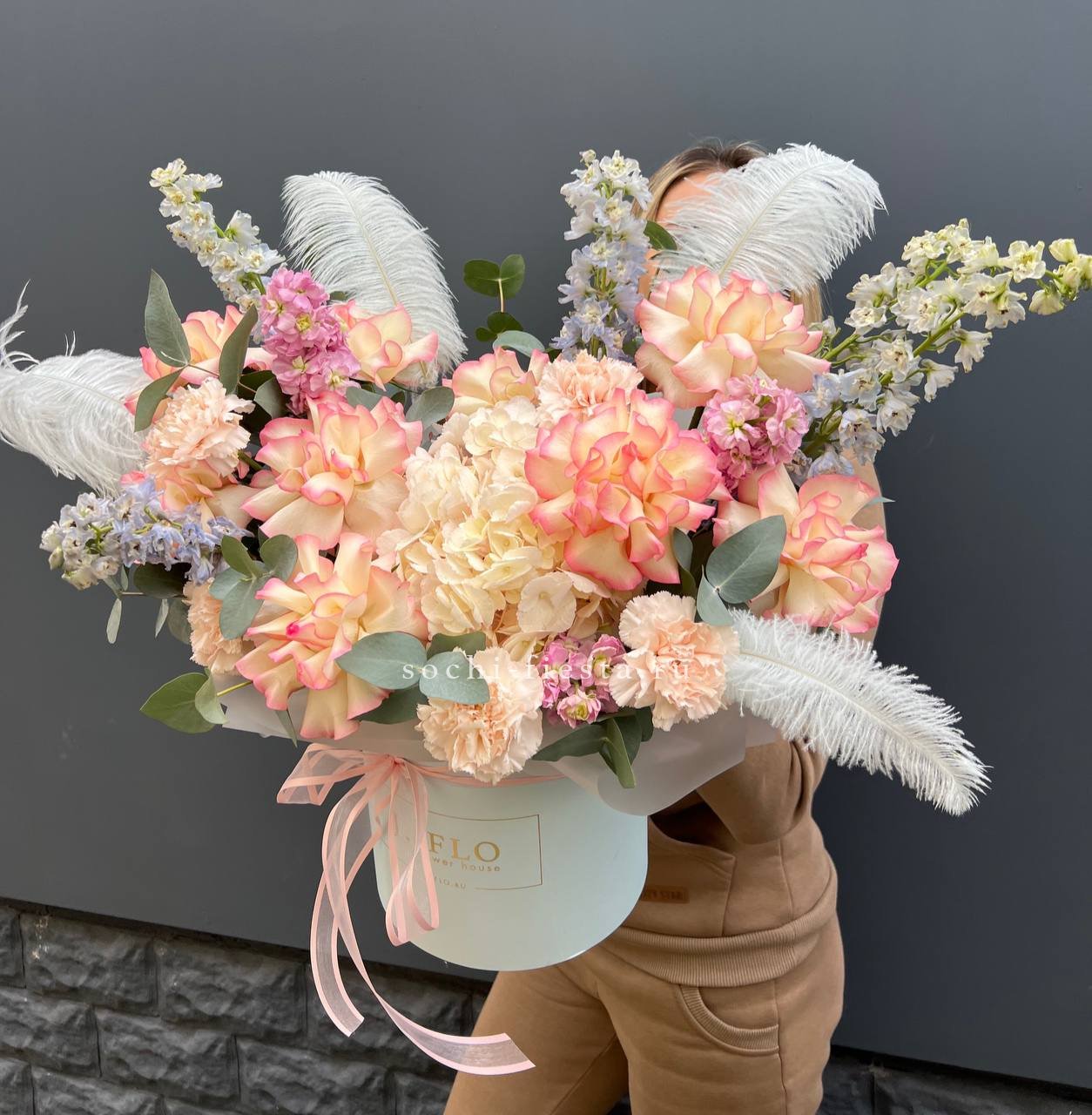 вывернутые  розы Джумилия, дельфиниум , гортензия, диантус, маттиола, цилиндр D20, эвкалипт, лента, упаковка.