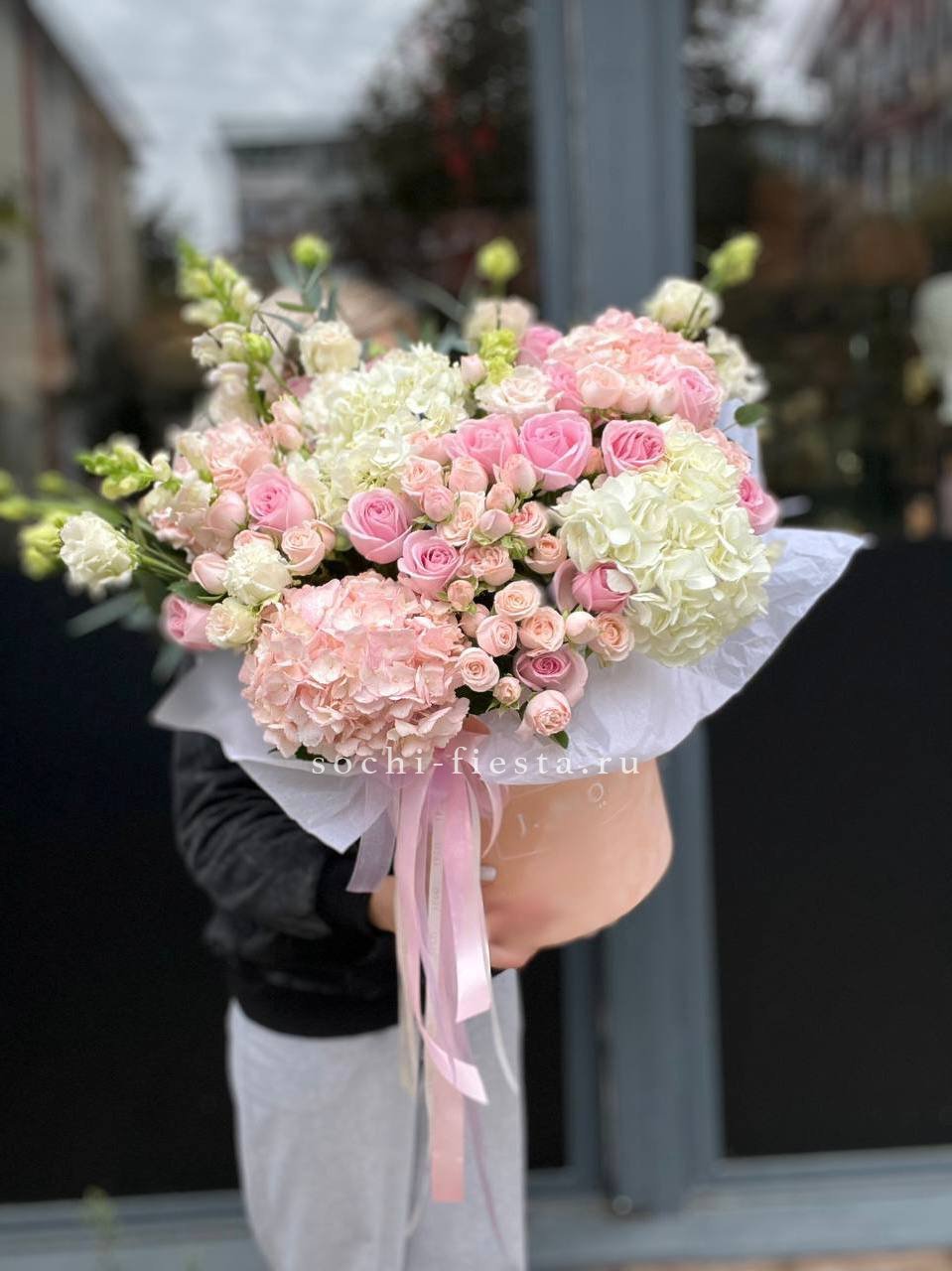 Гортензии формируют пышную базу, сквозь которую проступают бутоны роз и эустомы. Антиринум вытягивает силуэт вверх, а эвкалипт смягчает переходы между ярусами.
