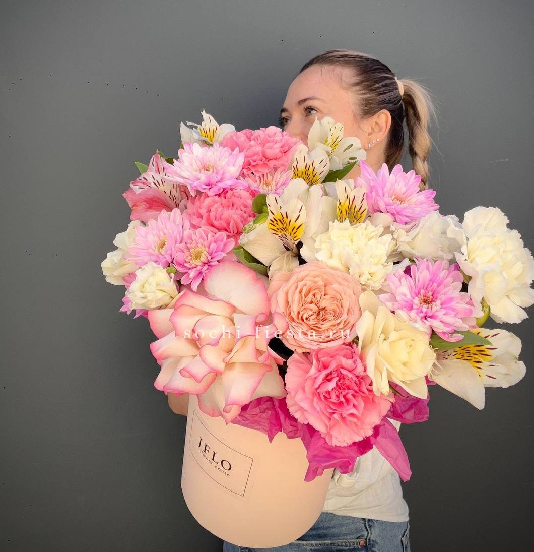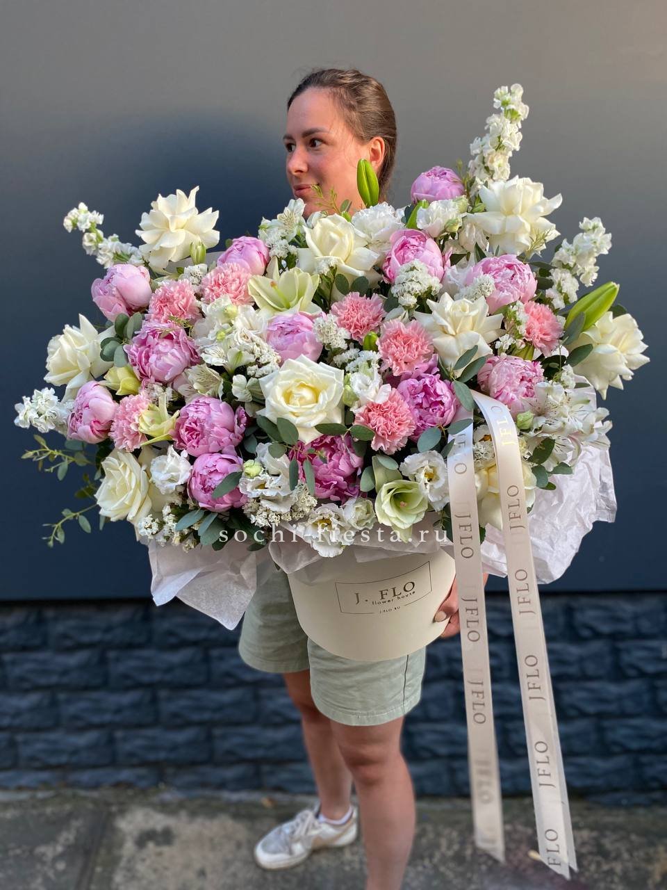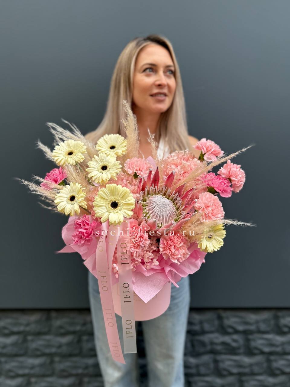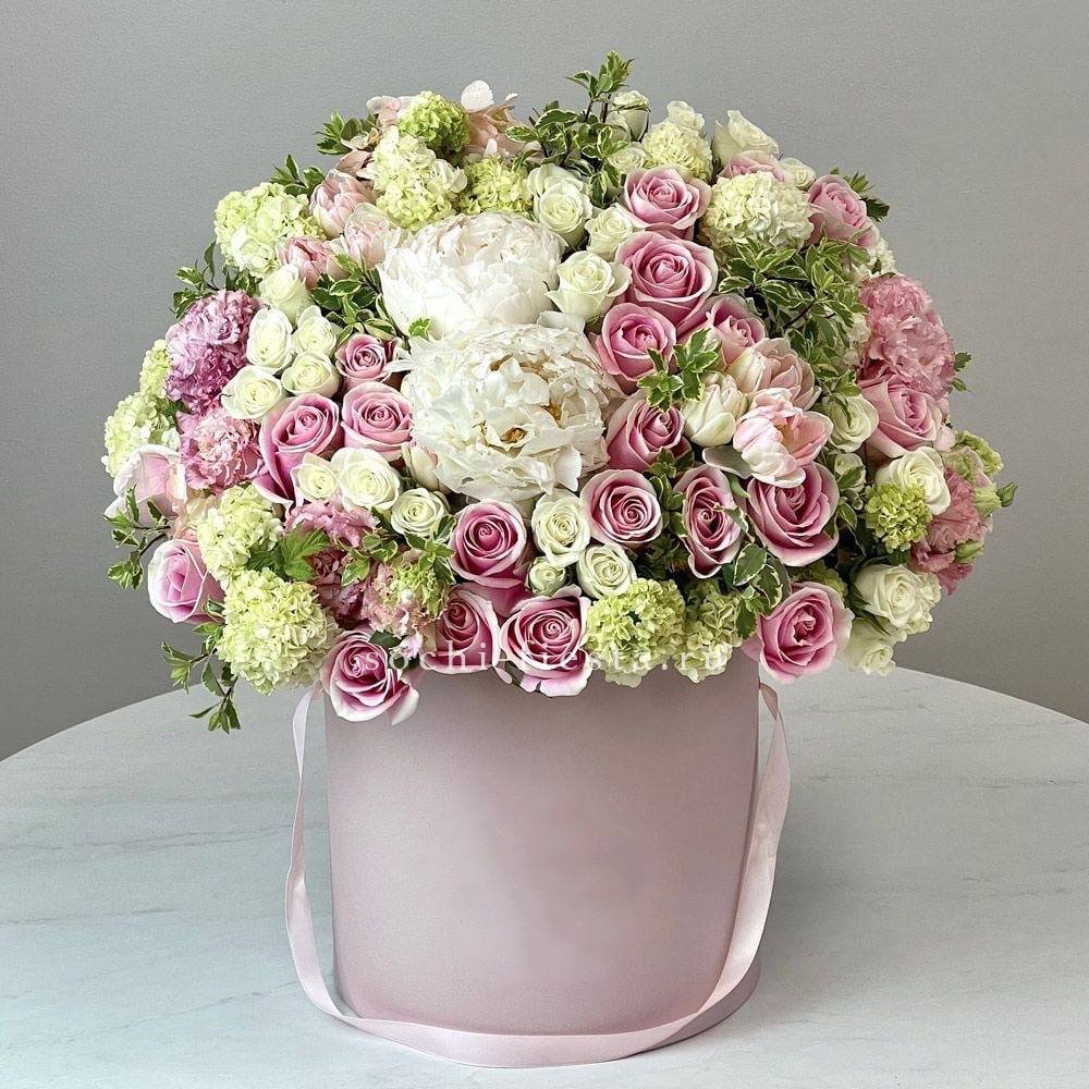 Композиция в коробке объединяет пышную гортензию, воздушную эустому и кустовые розы, Джумилию с яркими гербами и хлопком. Плотное заполнение создает округлую форму, где каждый цветок находит свое место без пустот.