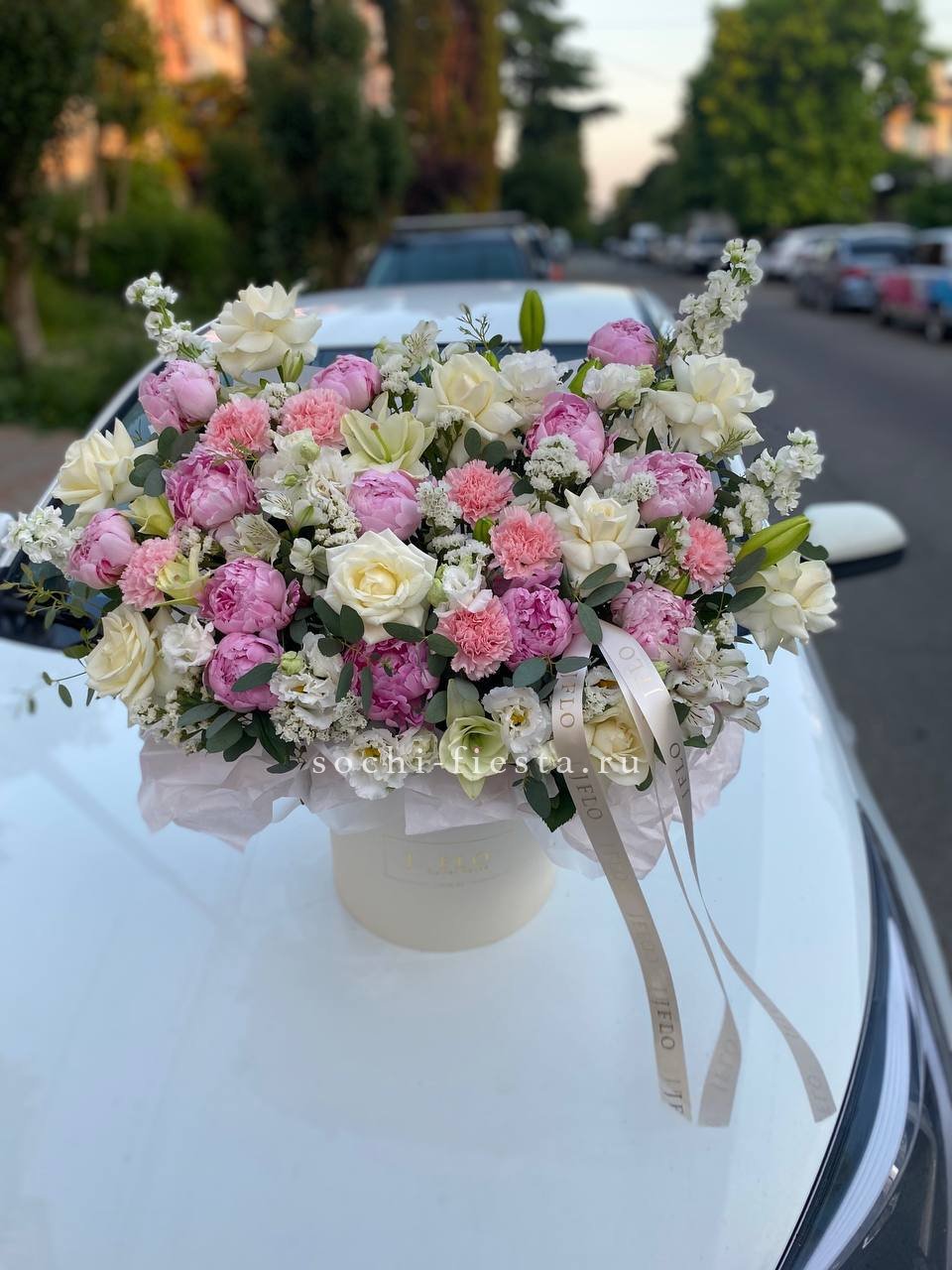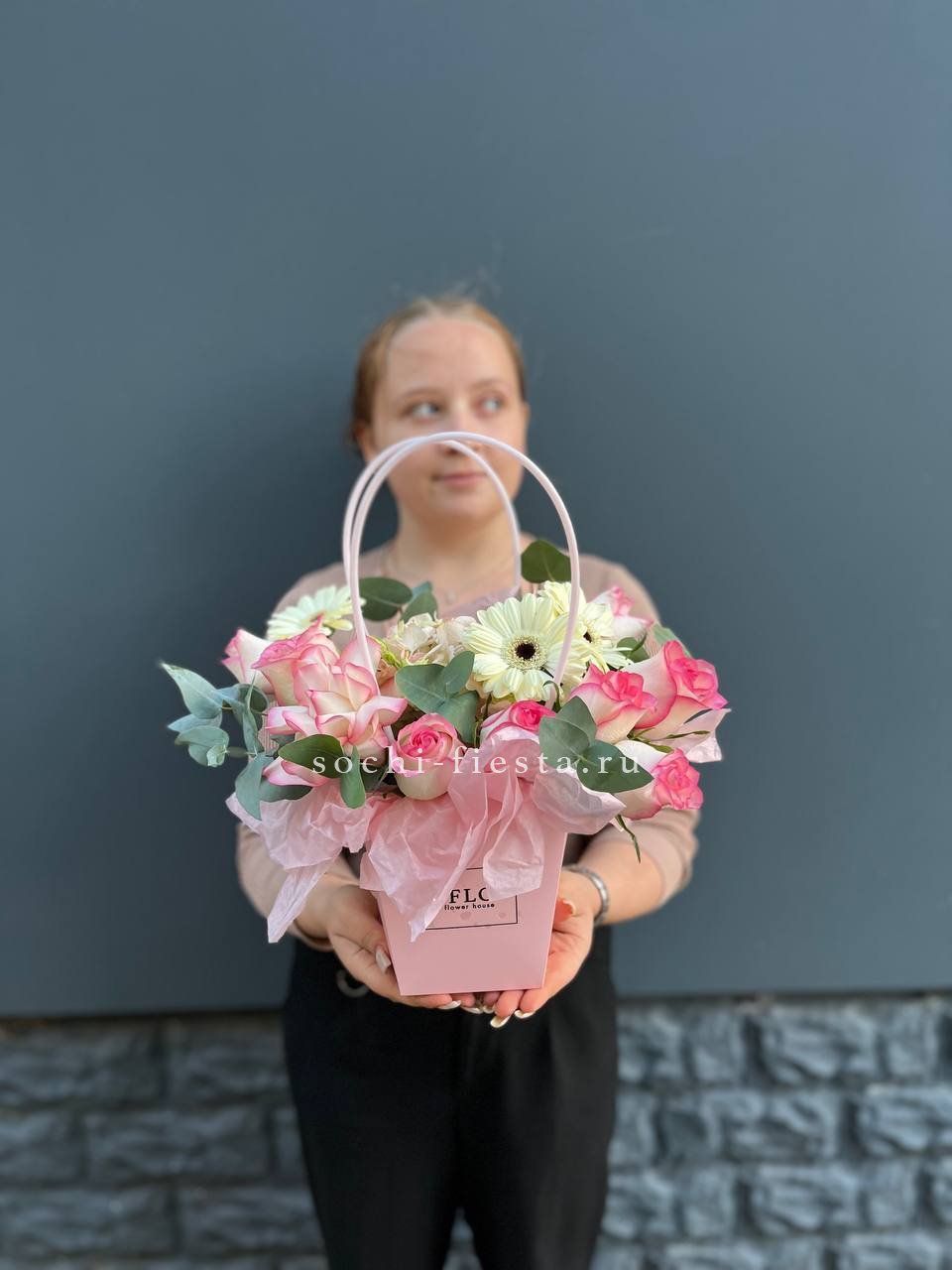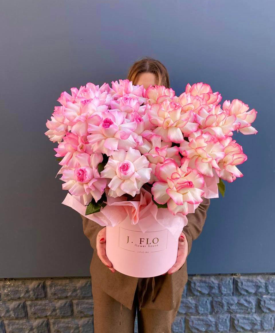 Композиция в коробке объединяет пышную гортензию, воздушную эустому и кустовые розы, Джумилию с яркими гербами и хлопком. Плотное заполнение создает округлую форму, где каждый цветок находит свое место без пустот.