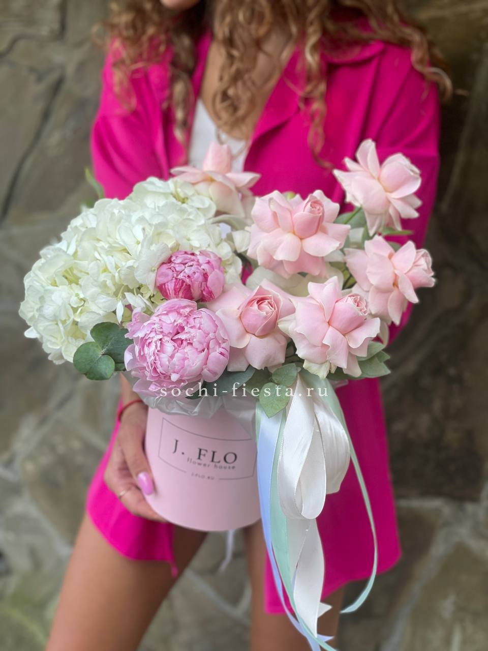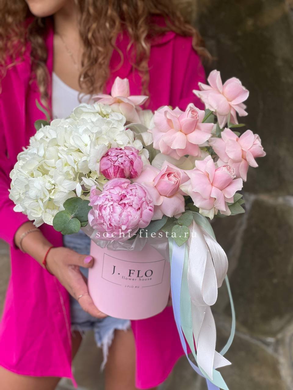 Пионы и гортензии наполняют композицию объемом и мягкой фактурой лепестков. Цилиндр собирает цветы в плотную форму, где каждый бутон находит свое место в общем движении.