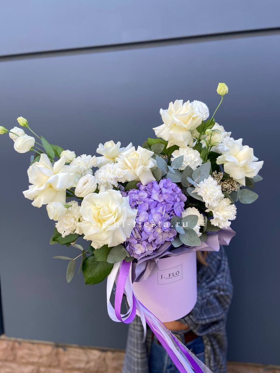 Гортензия обволакивает центр композиции, где розы и диантусы собраны плотной группой. Цилиндр держит форму вертикально, а лента завершает силуэт лаконичной линией.