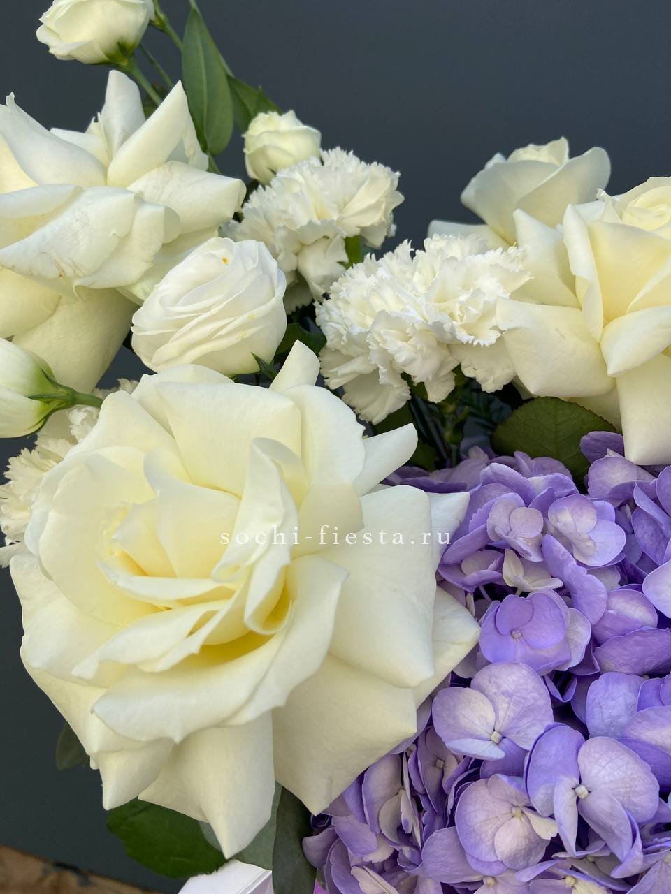 гортензия, одноголовые розы, пионовидные розы, диантусы, лента, цилиндр D20.