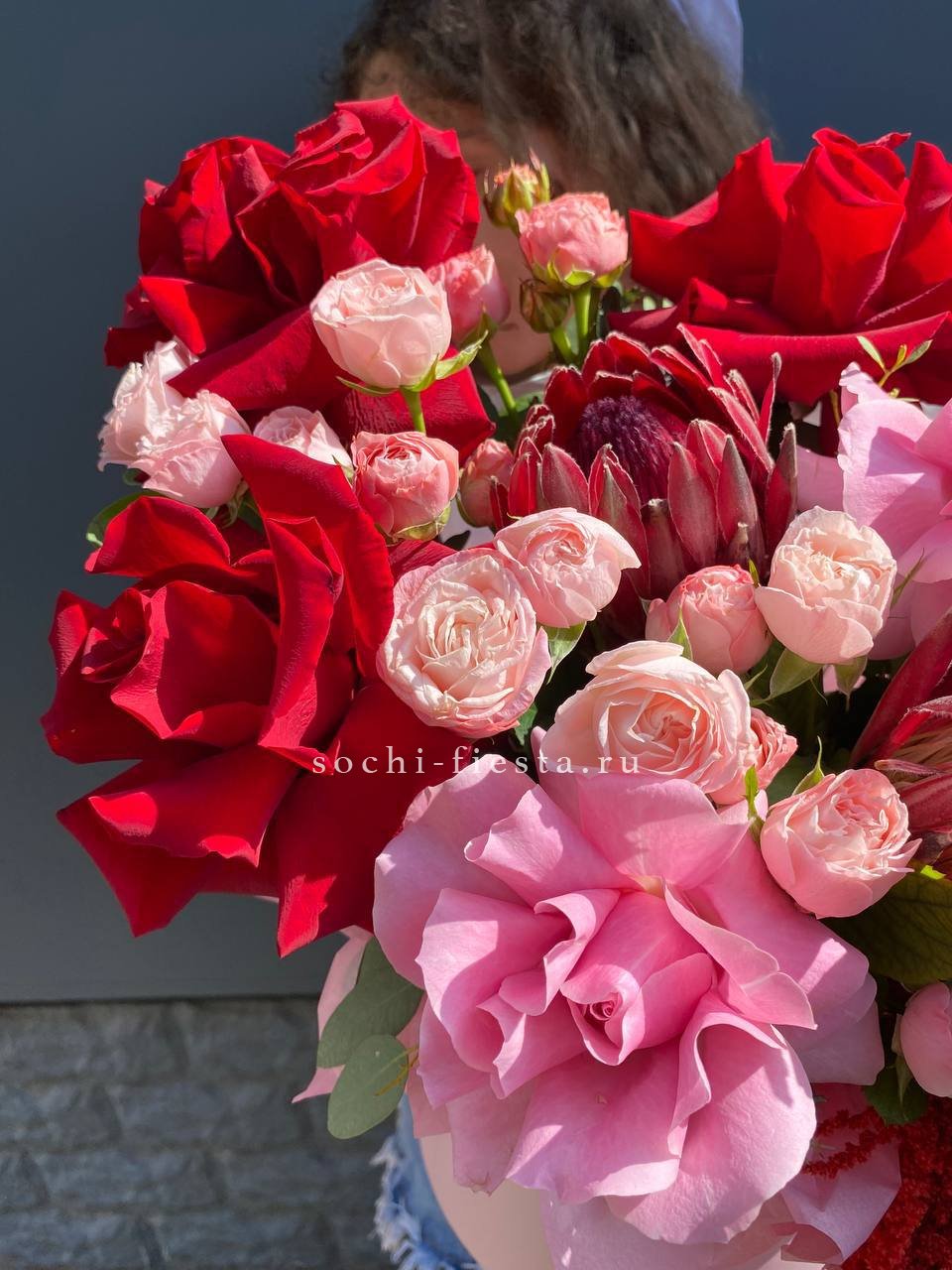 Букет выполнен в насыщенной красно-розовой гамме, создавая контрастное и выразительное сочетание, которое может символизировать сильные чувства или страсть. Это современный авторский букет, который выглядит роскошно и эффектно, подходящий для особых случаев и подарков.