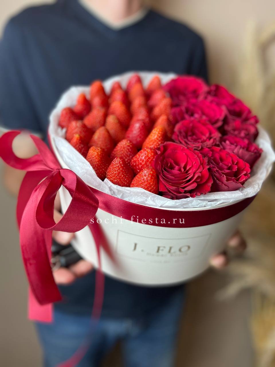 красная роза, клубника, цилиндр D25, лента.