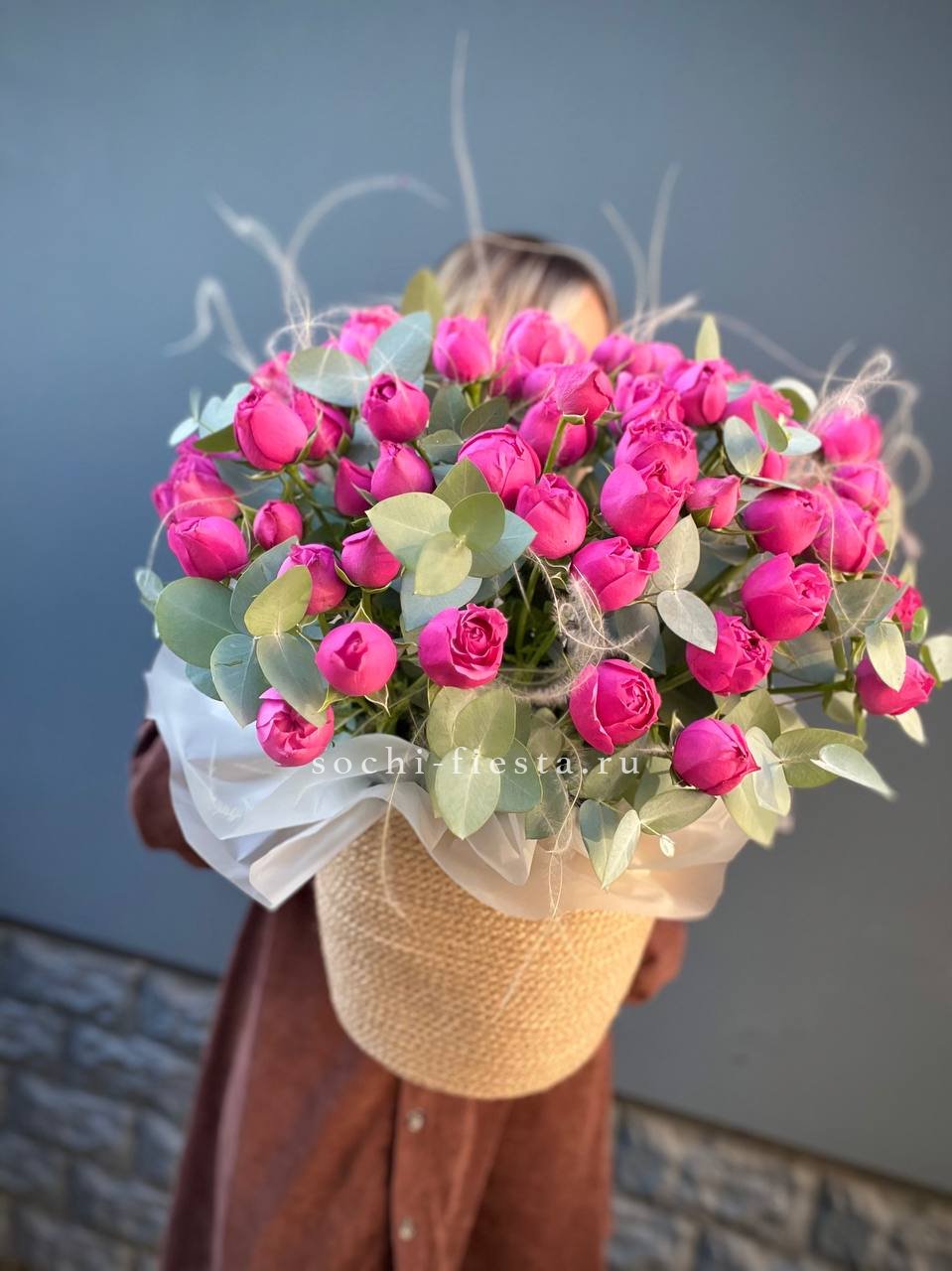 пионовидные розы Мисти Бабблс (25 веточек), джутовое кашпо, стифа, эвкалипт.
