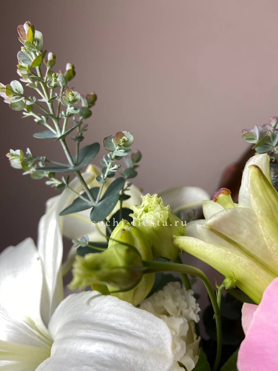 Белоснежные розы переплетаются с воздушной эустомой и раскрытыми лилиями в аккуратной цветочной сумке. Эвкалипт создаёт прохладный фон для светлых бутонов. Композиция на оазисе сохраняет свежесть и форму долгое время.