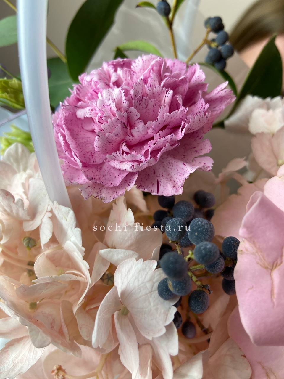 Розовые розы и диантусы переплетаются с кустовыми хризантемами в плотной округлой композиции. Альстромерия добавляет графичные акценты между бутонами. Сумочка собирает все элементы в аккуратную форму с естественным объёмом.