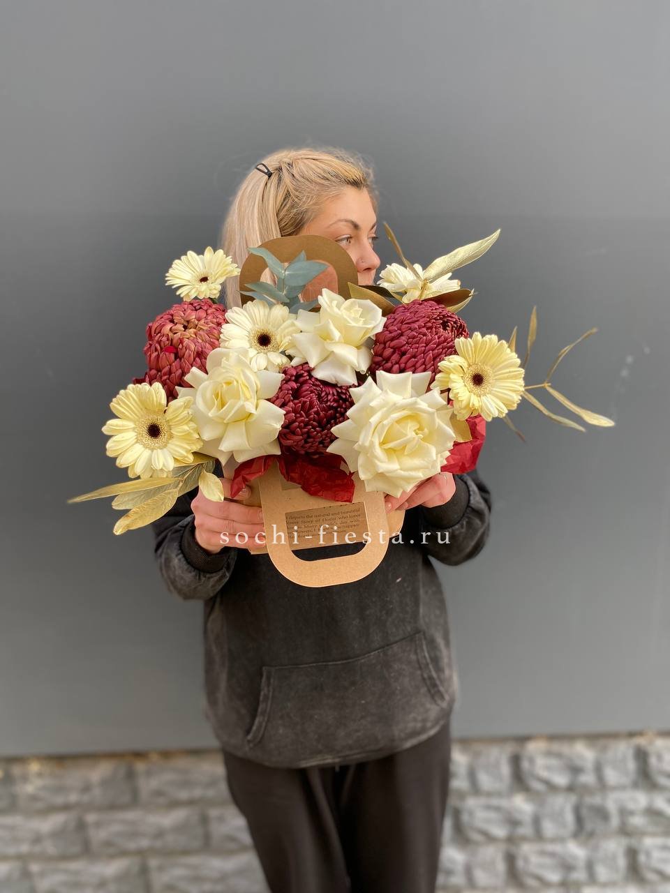 Яркая композиция в формате сумочки объединяет насыщенные герберы и белые розы. Бигуди добавляют графичности, эвкалипт завершает форму мягкими линиями.