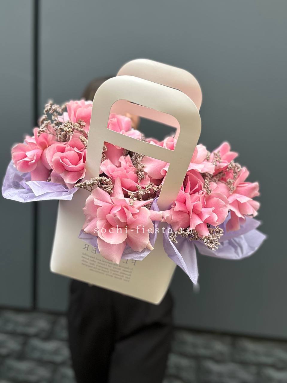 французские розы, лента, сумочка.