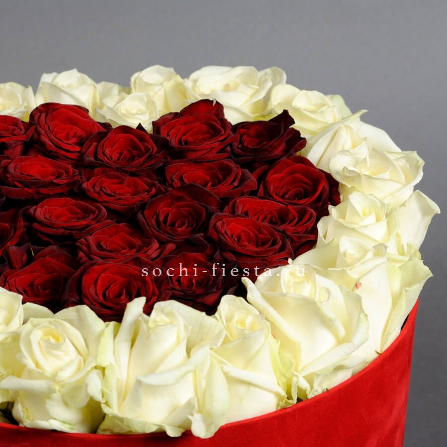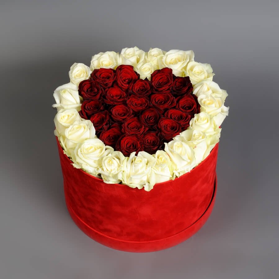 Герберы и розы двух оттенков выстроены плотными рядами в компактном боксе. Бомбастик придает текстуру, а эустома смягчает линии композиции.