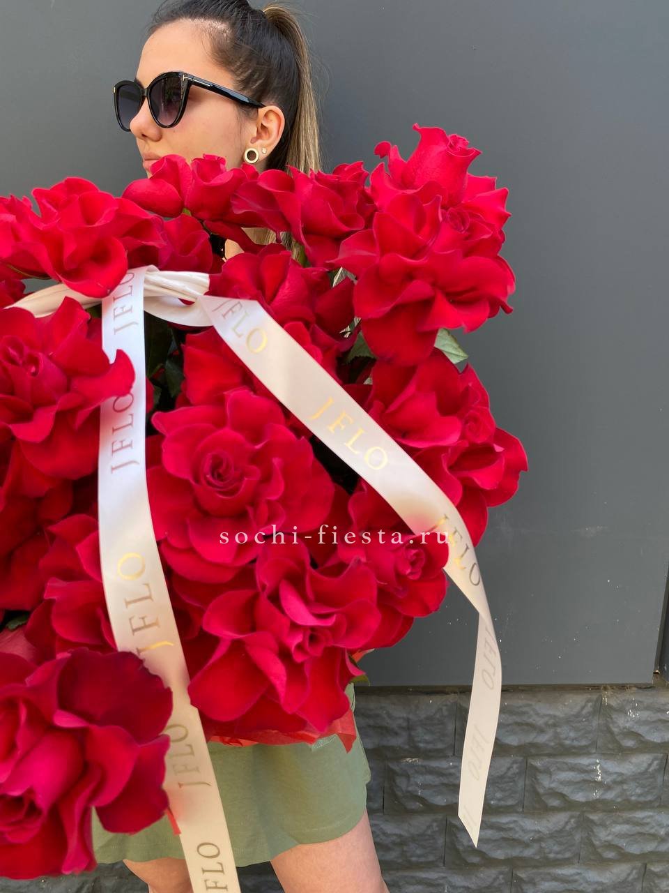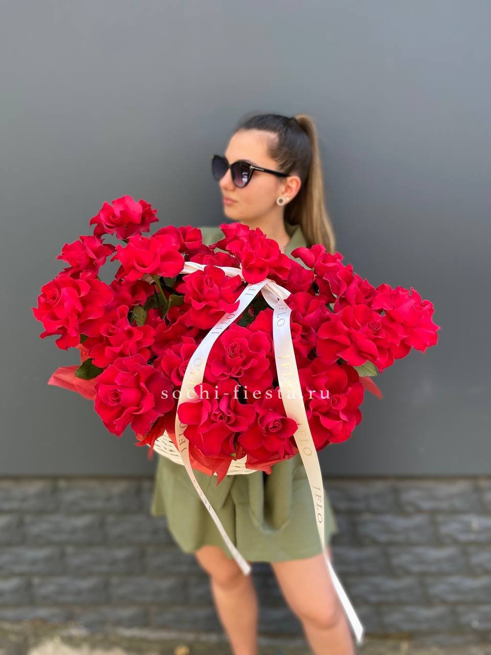 Пятьсот один бутон создает монументальную композицию в естественной корзине. Плотное заполнение формирует цельное полотно красного цвета, которое невозможно не заметить с первой секунды.