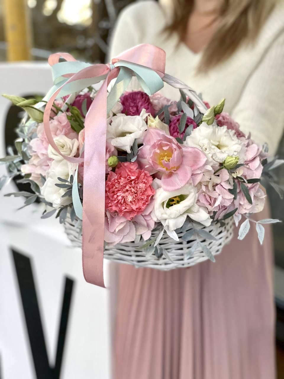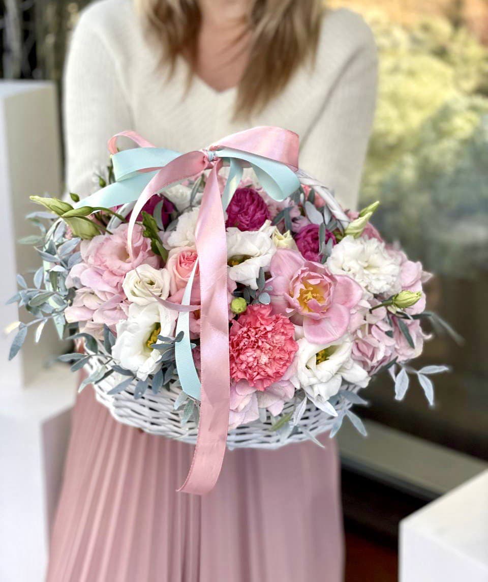 Восемь видов цветов складываются в harmonичную композицию со светлой корзиной в основе. Диантусы и эустома перекликаются с розами, а гортензия задает мягкий объем всей структуре.