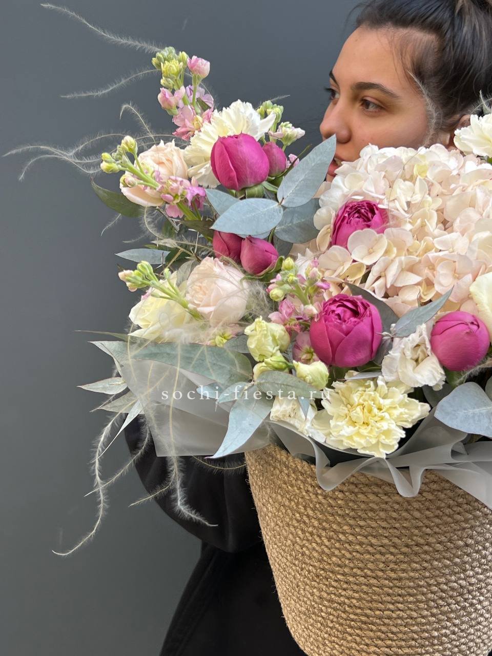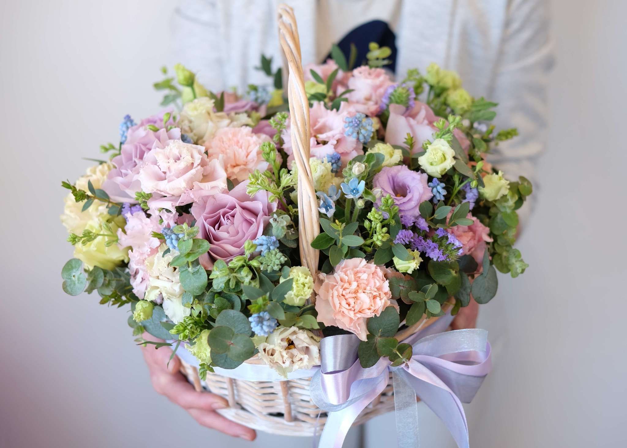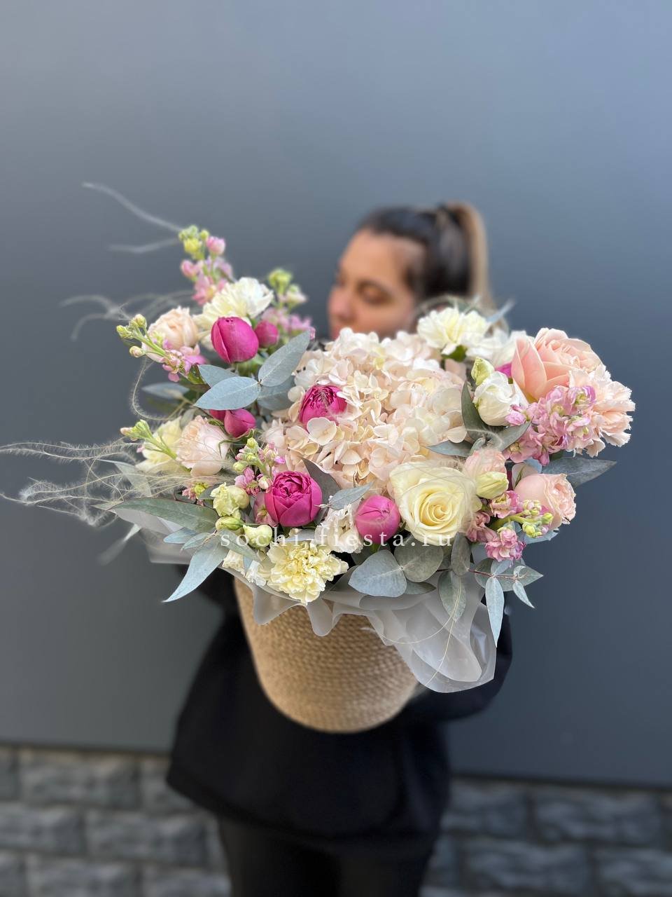 Плотная россыпь бутонов в плетеной корзине создает живописную композицию с переходами от сиреневых до пудровых оттенков. Гортензия и маттиола задают воздушный объем, а розы разной раскрытости добавляют глубину и многослойность всей картине.