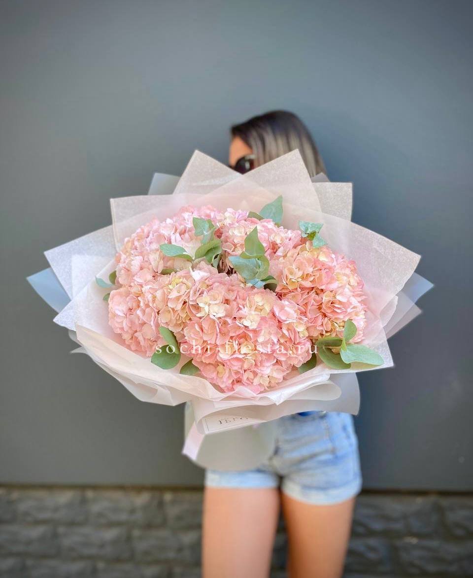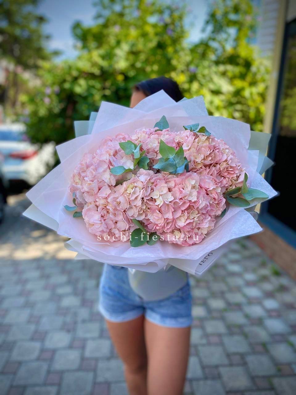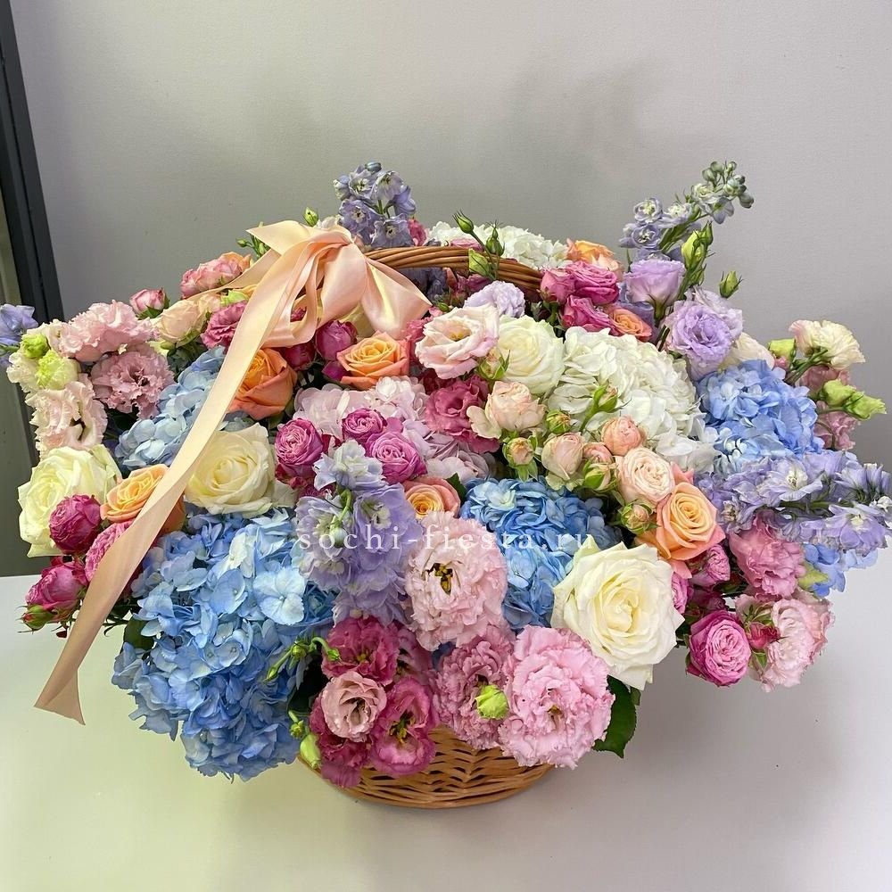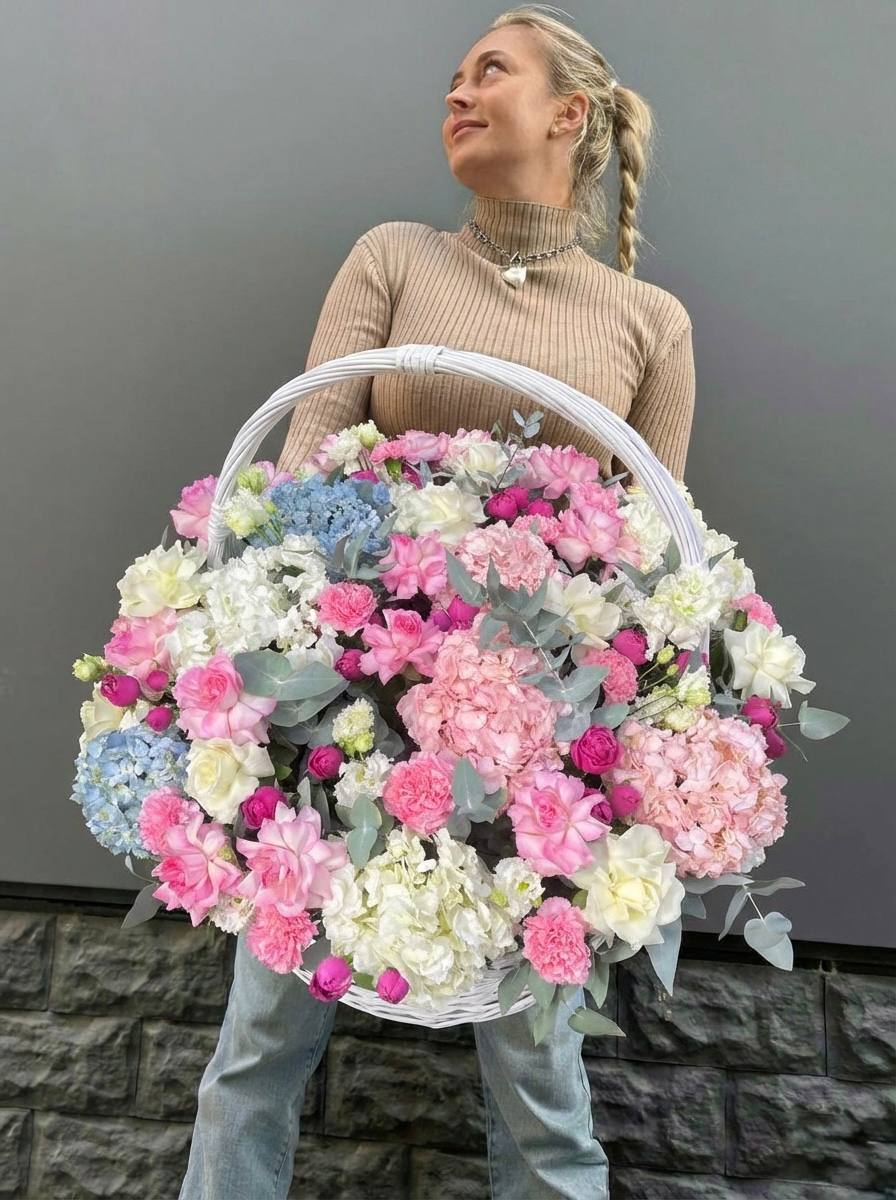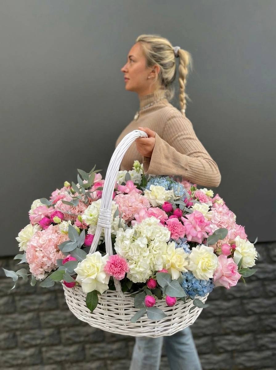 гортензия нежно-розовых оттенков, эустома, лилии, диантус, кустовая роза, эвкалипт, вспомогательная зелень, лента, светлая корзина.