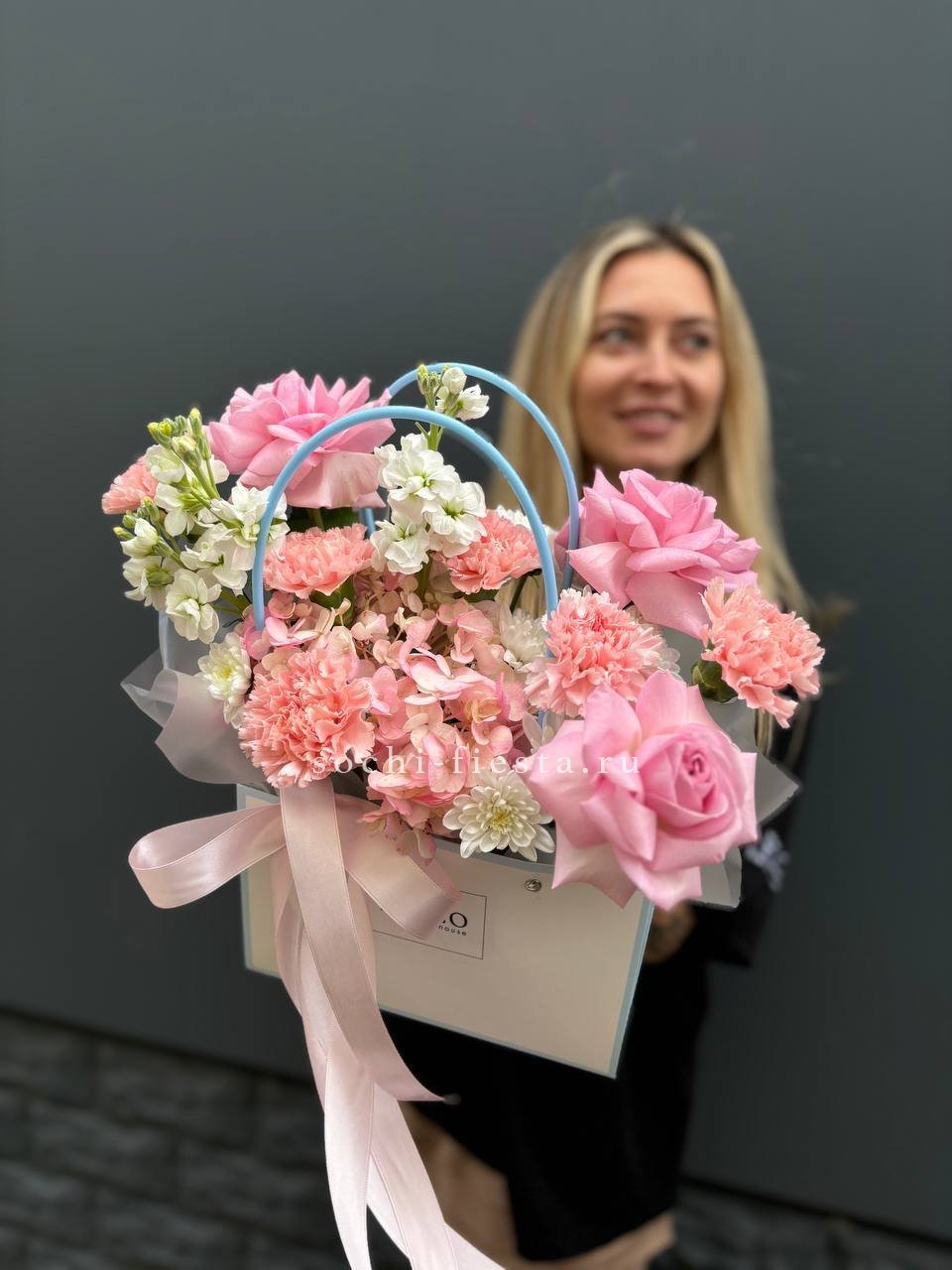 Гортензия задаёт объём, лилии вытягивают силуэт вверх. Диантусы и кустовые розы заполняют пространство между крупными соцветиями.
