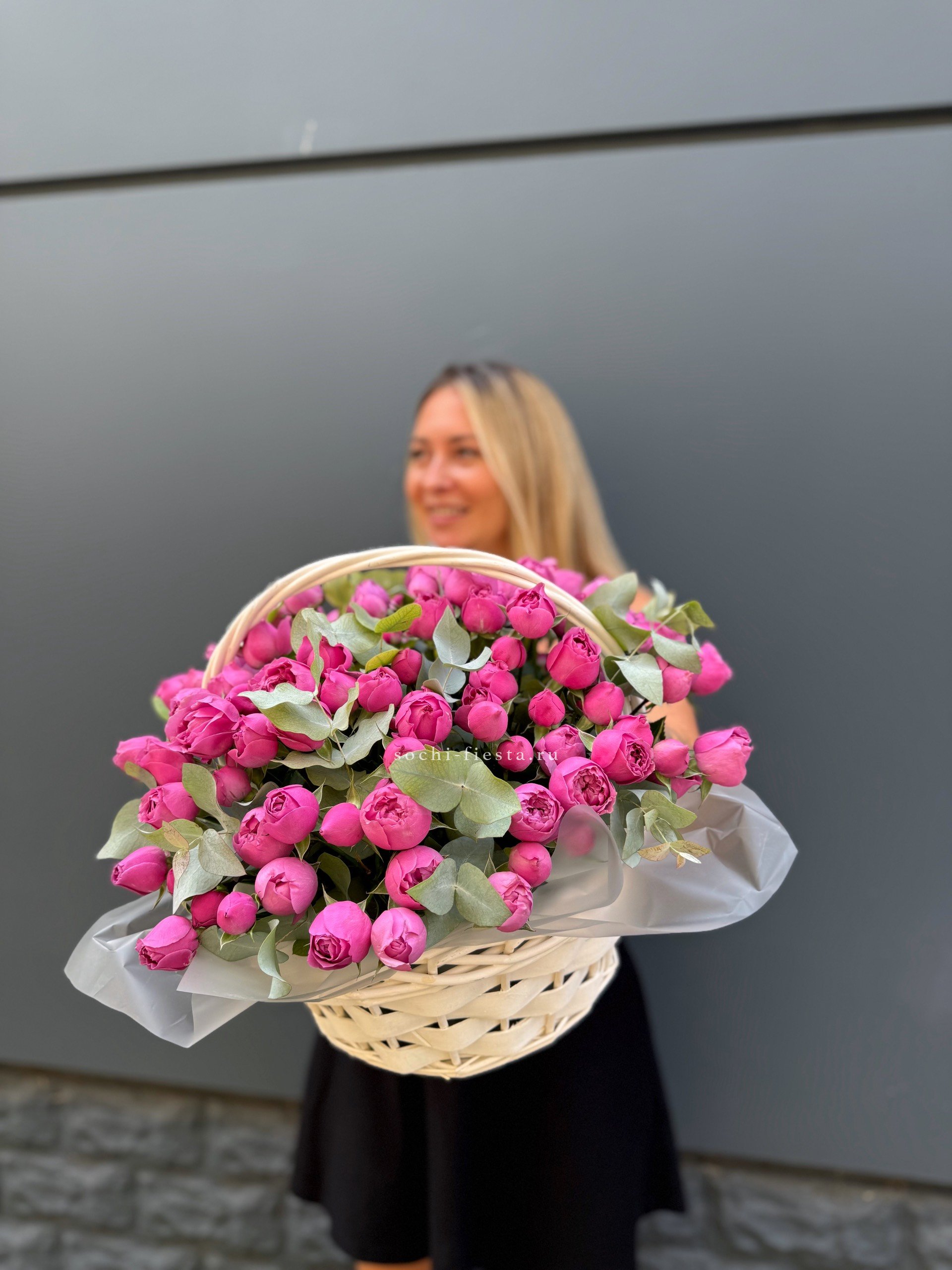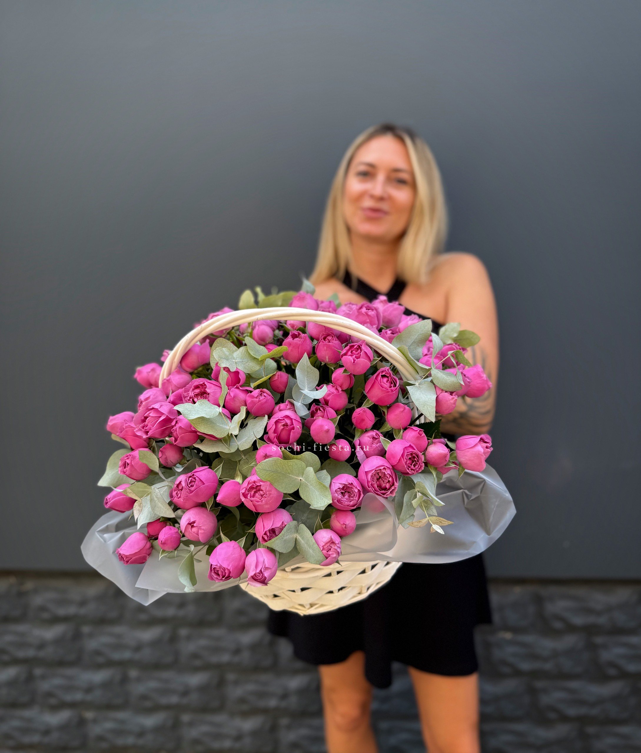 Пышная корзина объединяет пионовидные розы с воздушной гортензией и многослойной эустомой. Матиолла и лимониум добавляют глубину композиции, а диантус создает мягкие переходы между крупными бутонами.