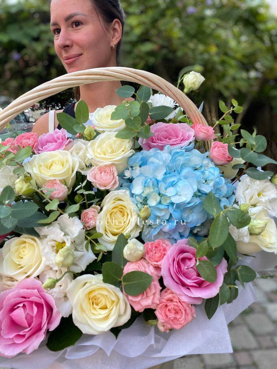 Воздушные соцветия эустомы собраны в округлую композицию с мягким переходом пастельных тонов. Светлая корзина создает легкую базу для объемной цветочной шапки.