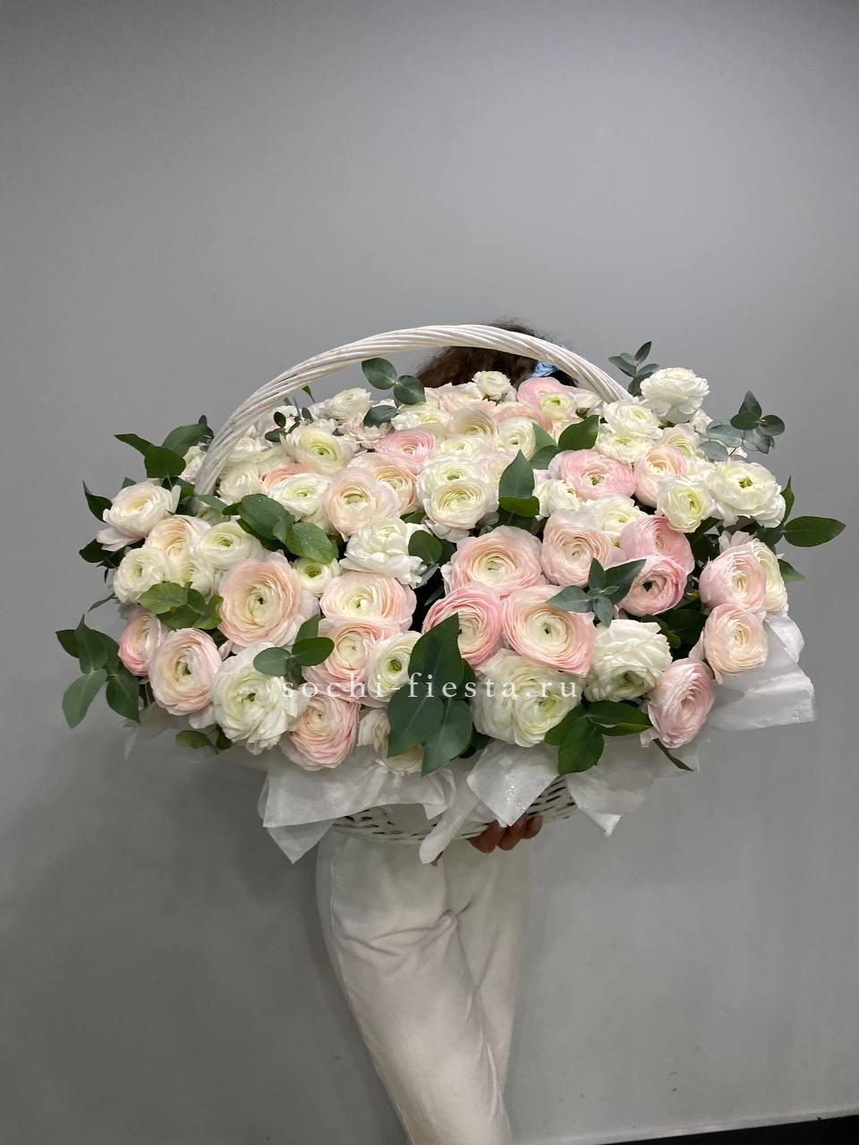 Монументальная композиция из полутора сотен белоснежных бутонов создает впечатление цветочного облака. Корзина придает устойчивость и завершенность форме, позволяя разместить такой масштабный ансамбль в любом пространстве.