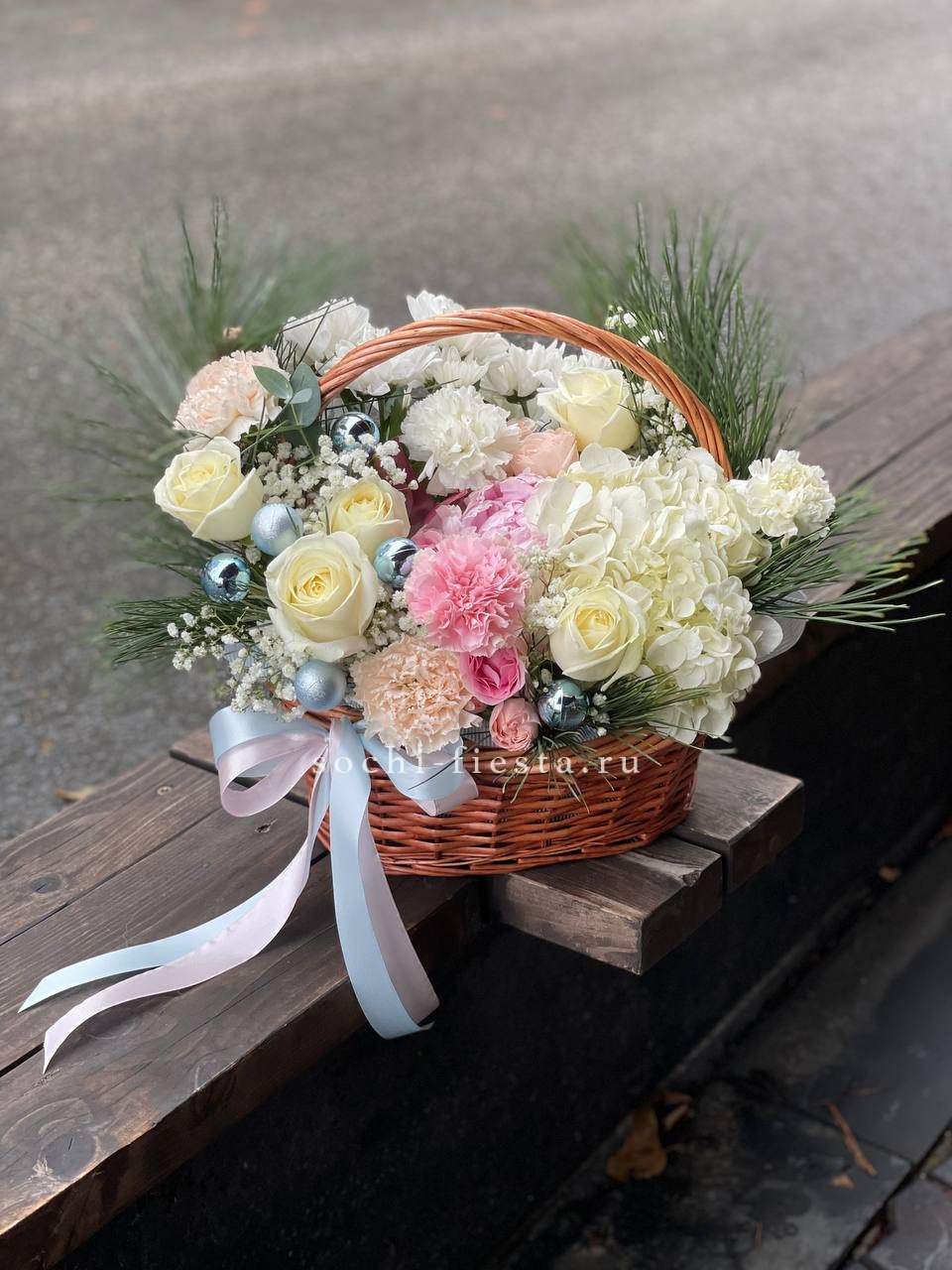 гортензия, роза, игрушки, хризантемы, диантусы, гипсофила, ель, бомбастик, корзина, оазис, лента.
