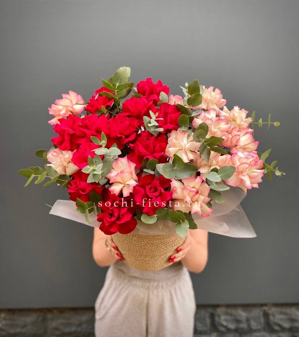 501 белая и красная роза в корзине.