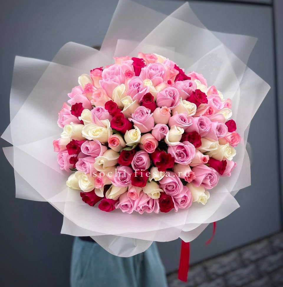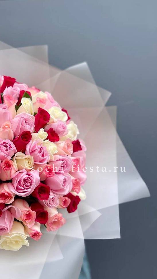 Длинные стебли и крупные бутоны в палитре микс создают букет с графичным силуэтом. Сто одна роза выстраивается в плотную композицию с выразительной вертикалью.