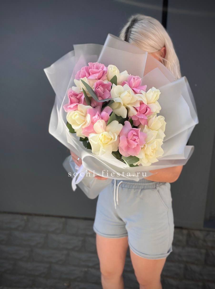 Переход от светлых до насыщенных розовых оттенков создает мягкую градацию в букете. Пятнадцать роз образуют воздушную композицию, которая наполняет пространство теплом.