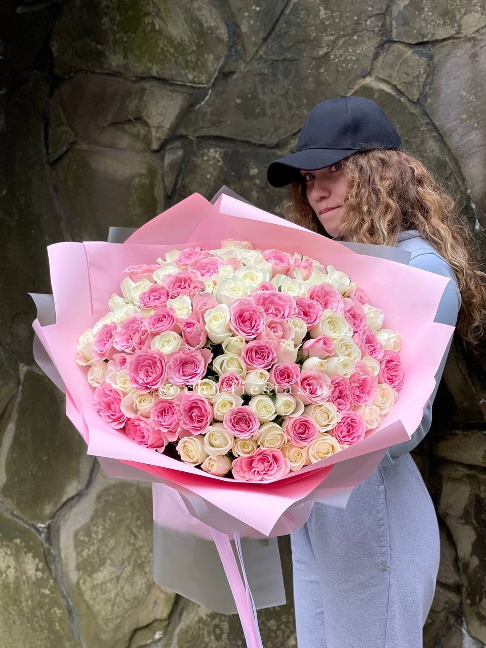 Сто один бутон в бело-розовой палитре создают объёмное облако цвета. Композиция впечатляет масштабом и наполняет пространство мягким сиянием лепестков.