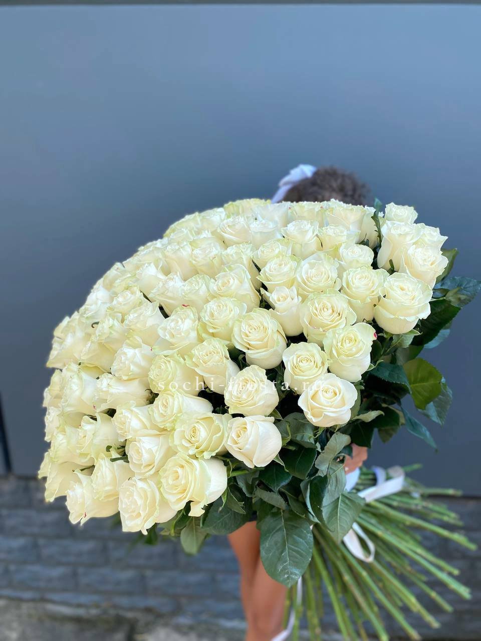 Сто одна белая роза собрана в впечатляющую охапку. Монохромная гамма и повторяющийся ритм бутонов создают мощное визуальное присутствие. Такой объём заполняет пространство и приковывает внимание.