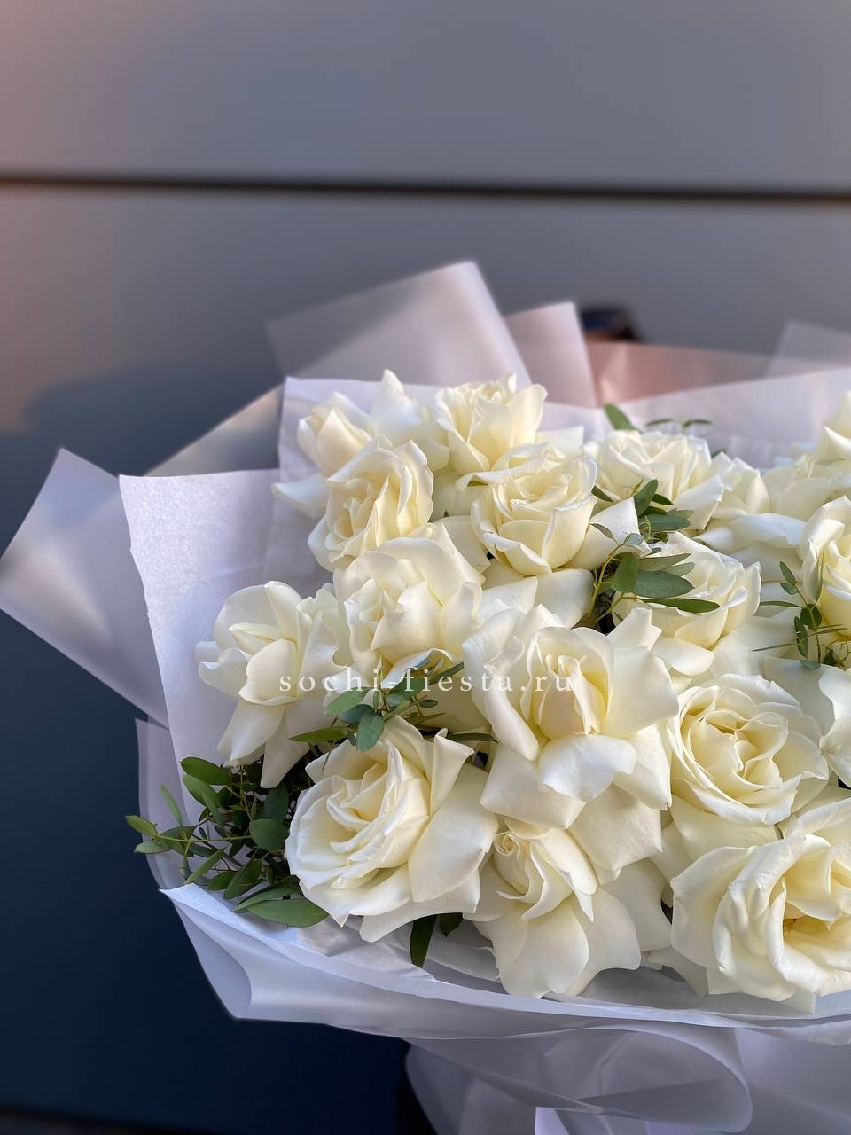 белые французские розы в боксе с эвкалиптом.