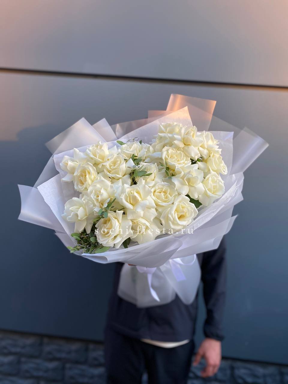 Тридцать семь белых французских роз собраны в круглый бокс с ветками эвкалипта. Плотная укладка бутонов создает объемную композицию, где каждый цветок виден и держит форму. Безупречное решение для яркого события.