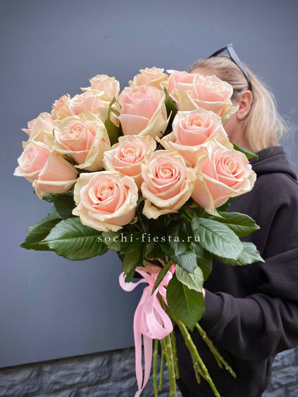 Пятнадцать роз на удлиненных стеблях выглядят графично и современно. Кремовые лепестки сохраняют свежесть и форму в течение долгого времени.